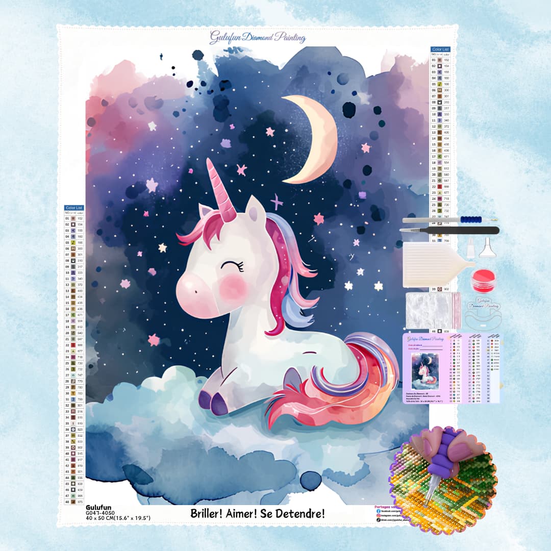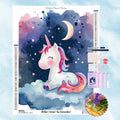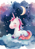 🥰 On a starry night, the unicorn lies on the clouds and the moon shines in the sky. The pink and blue mane and shy expression are so adorable! 💖