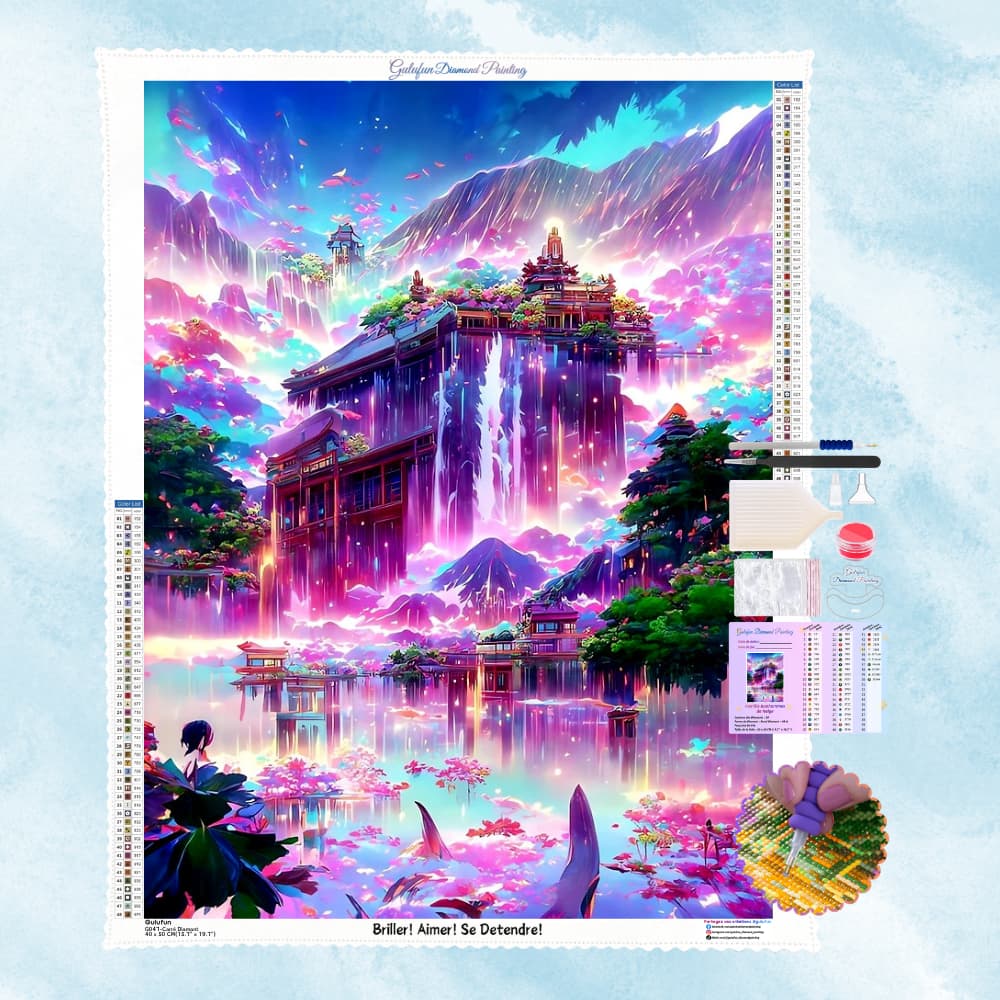 The fairy tower rises above the green hills, and a waterfall reflects the red water. Accompanied by pink lotuses and koi carp, the scene resembles a fairyland.