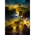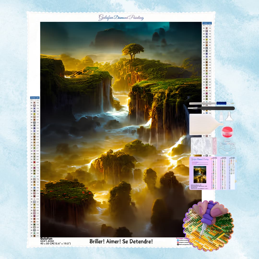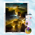 The green cliffs and cascading waterfalls are shrouded in mist, and the shining sunlight shines with a golden light.