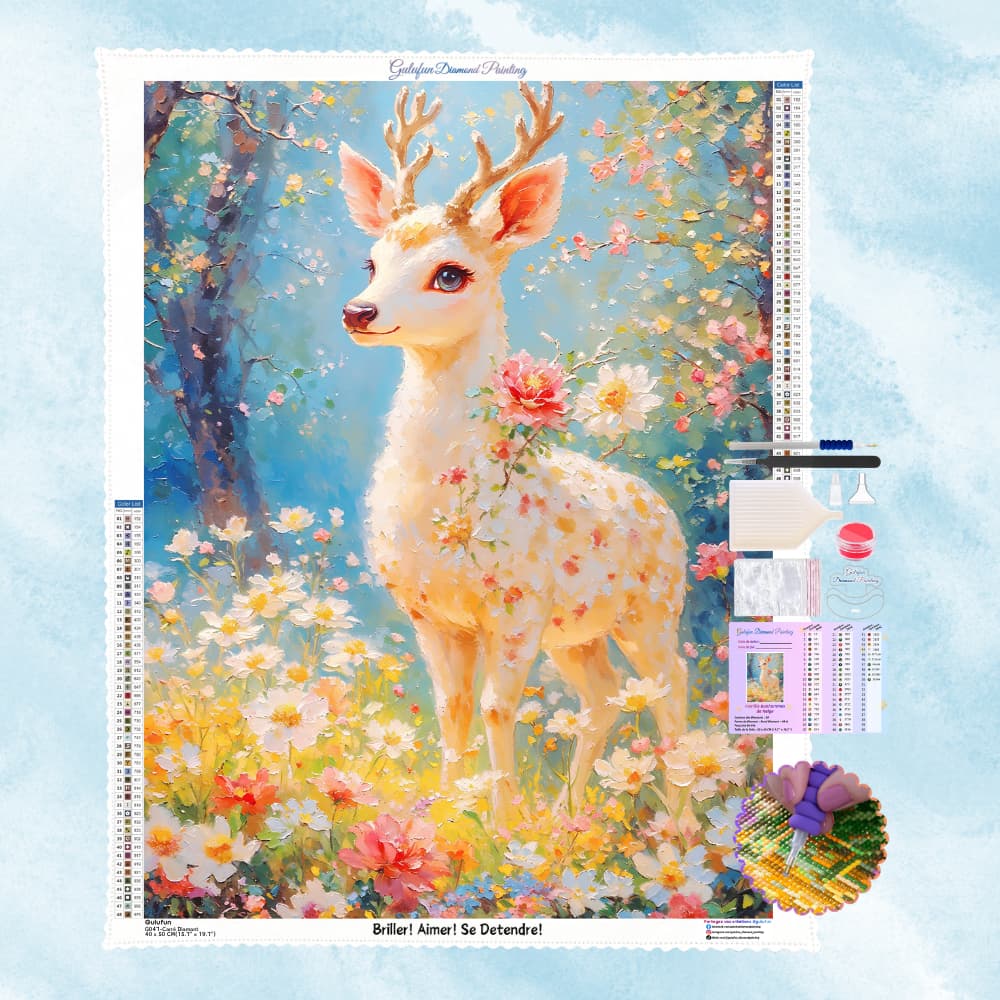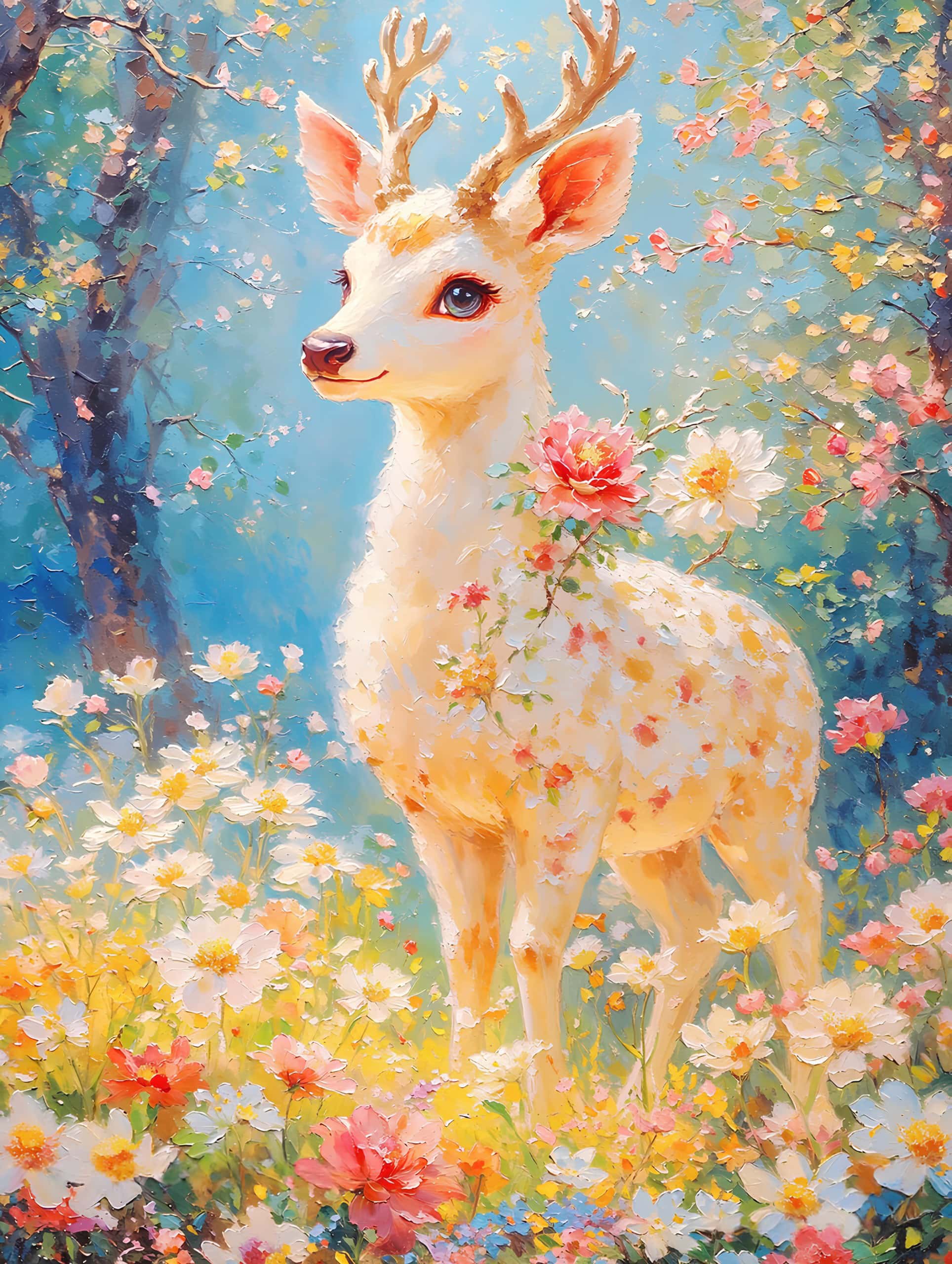 The deer in the painting is covered in flowers and stands quietly among the blooming flowers.