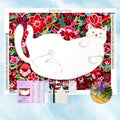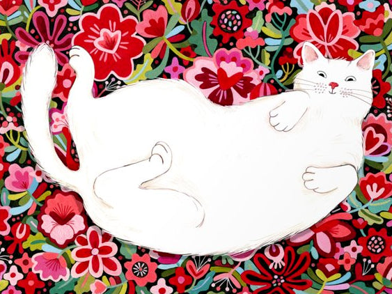 A white cat is lying in the flowers, very comfortable and relaxed.