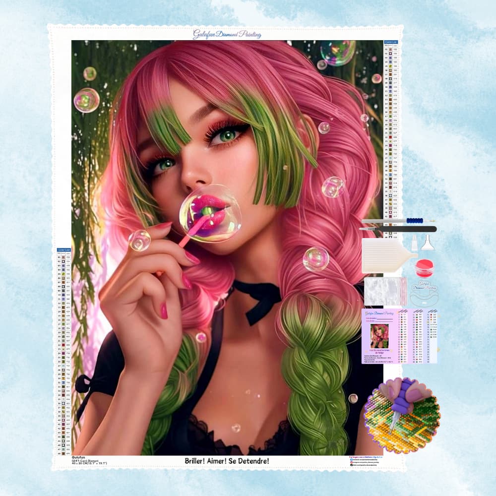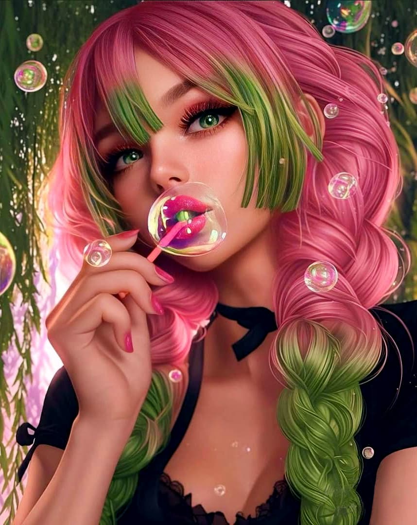 The girl had playful, bright pink and green hair, as if she had stepped out of a candy world. She blinked her bright green eyes and blew colorful bubbles from her lips. The pink manicure on her fingertips echoed the bubble wand. Every detail exuded the girl's innocence and kindness.
