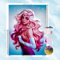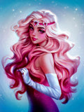 The girl's long pink hair is as silky as silk, showing off her elegance. She wore a floral headband, resembling a goddess from ancient Greek mythology. Her slightly sideways posture seems to indicate that she is awaiting an encounter that transcends time and space, conveying a subtle yet profound romantic feeling.