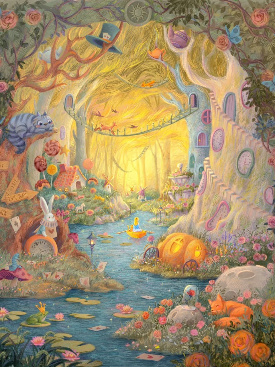 The small animals look like elves in a fantasy world, and the roses and decorations on the large trees are romantic embellishments.