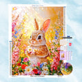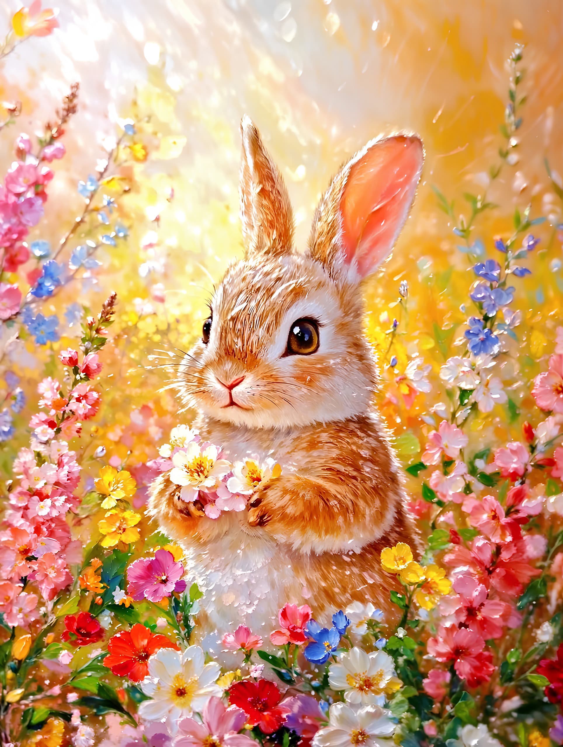 The cute bunny stands quietly, holding flowers in its arms, with stars in its eyes.