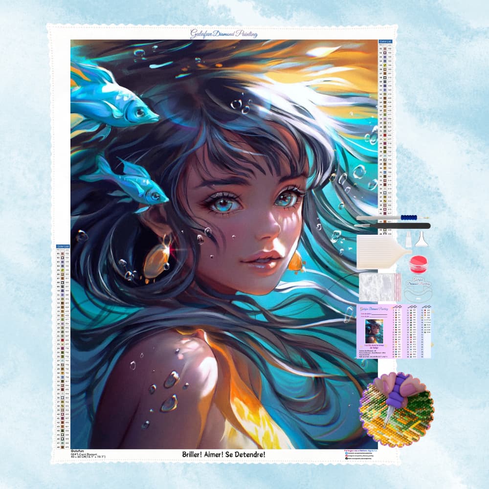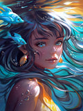 The girl's blue hair, floating like seaweed, shimmered with a mysterious glow in the intertwining of light and shadow. The agile fish surrounded her, acting like the elf companions in her dreams. Water drops rolled over her hair and skin, and the soft light and shadow cast a veil over the image, giving people the impression of being in a dreamlike aquatic world, far from the hustle and bustle of the world.