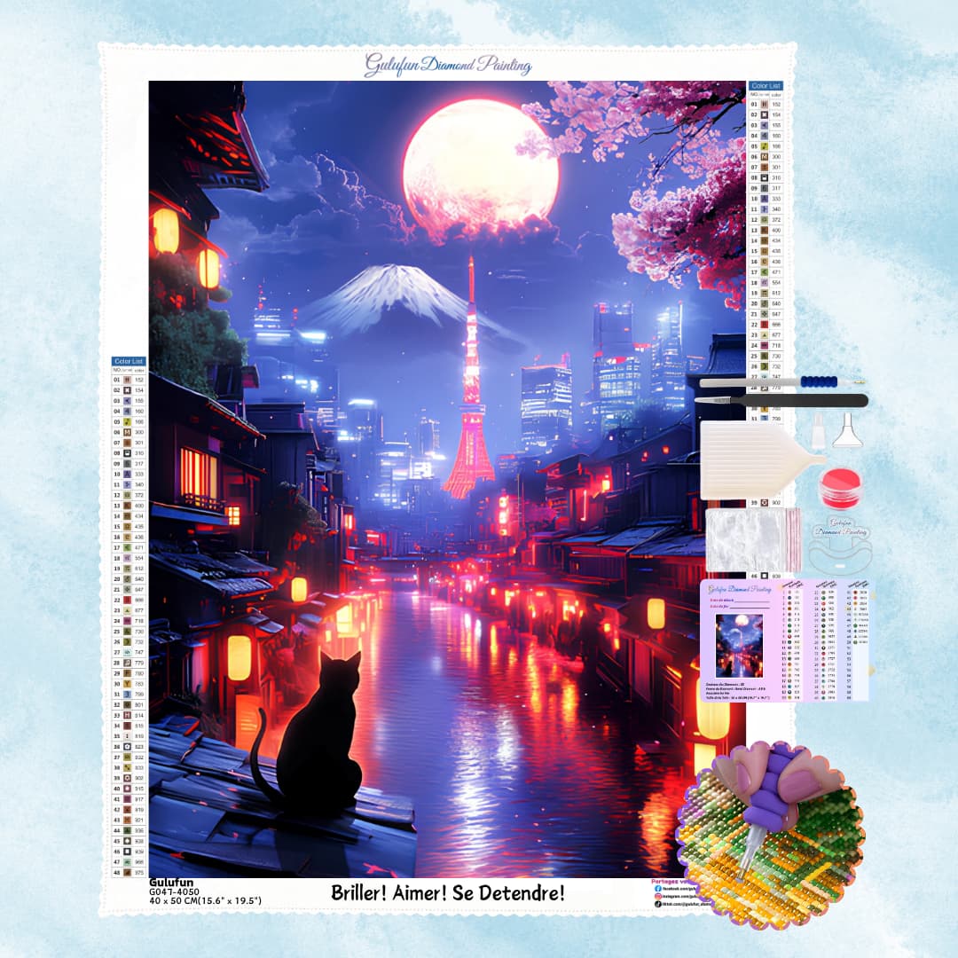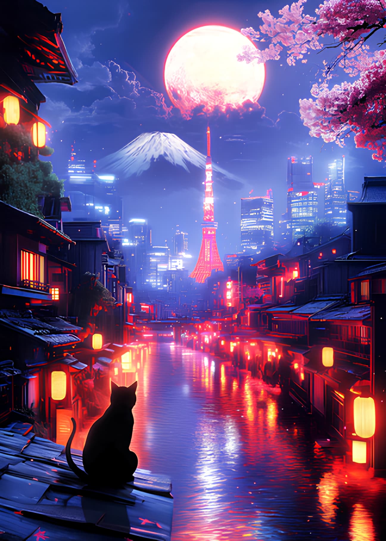 The city, enveloped by the immense moon, seems covered in a mysterious veil. Mount Fuji 🗻 and the Paris Tower 🗼 in the distance echo each other, and the picturesque Japanese houses 🏠 nearby are reflected in the water, sparkling and beautiful like a painting!