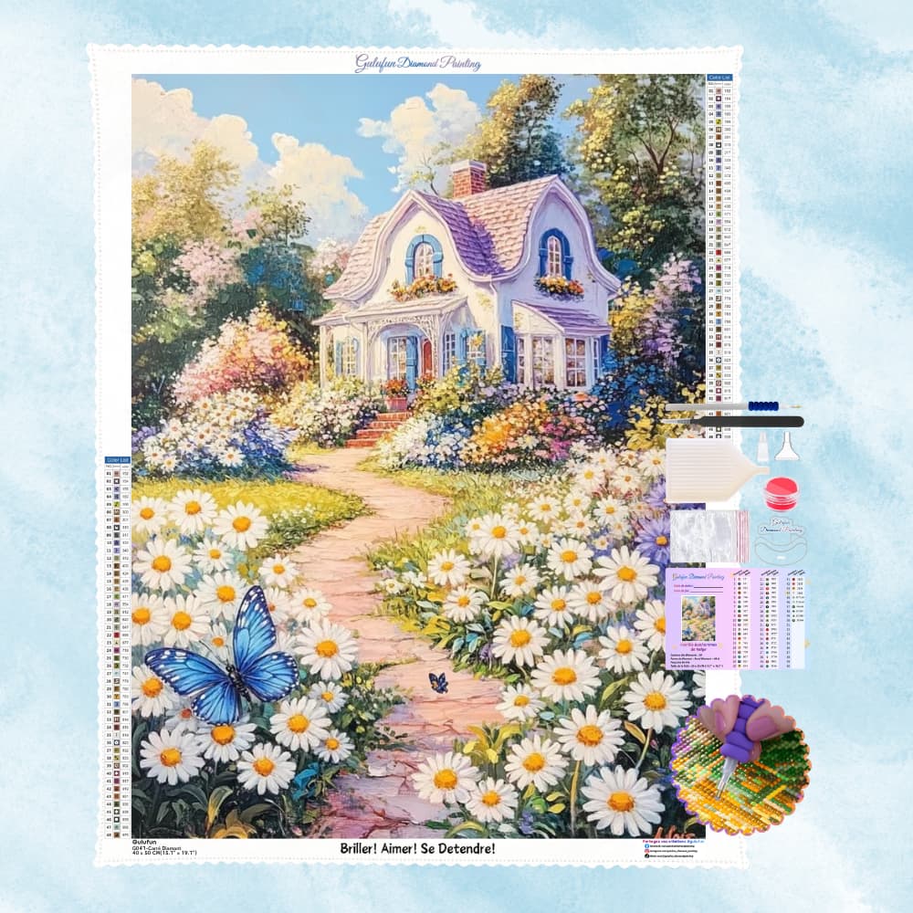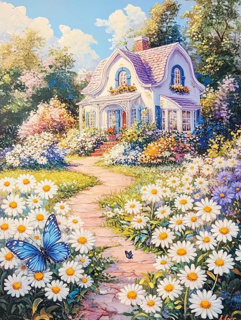 The cottage is a warm representation of pastoral life, with a pink and purple roof and fresh and elegant blue and white exterior walls. Daisies are in full bloom, covering both sides of the path, adding brilliant colors to the countryside. Surrounded by green trees, with butterflies dancing among them and a blue sky and white clouds in the distance, it is like a melodious pastoral song.