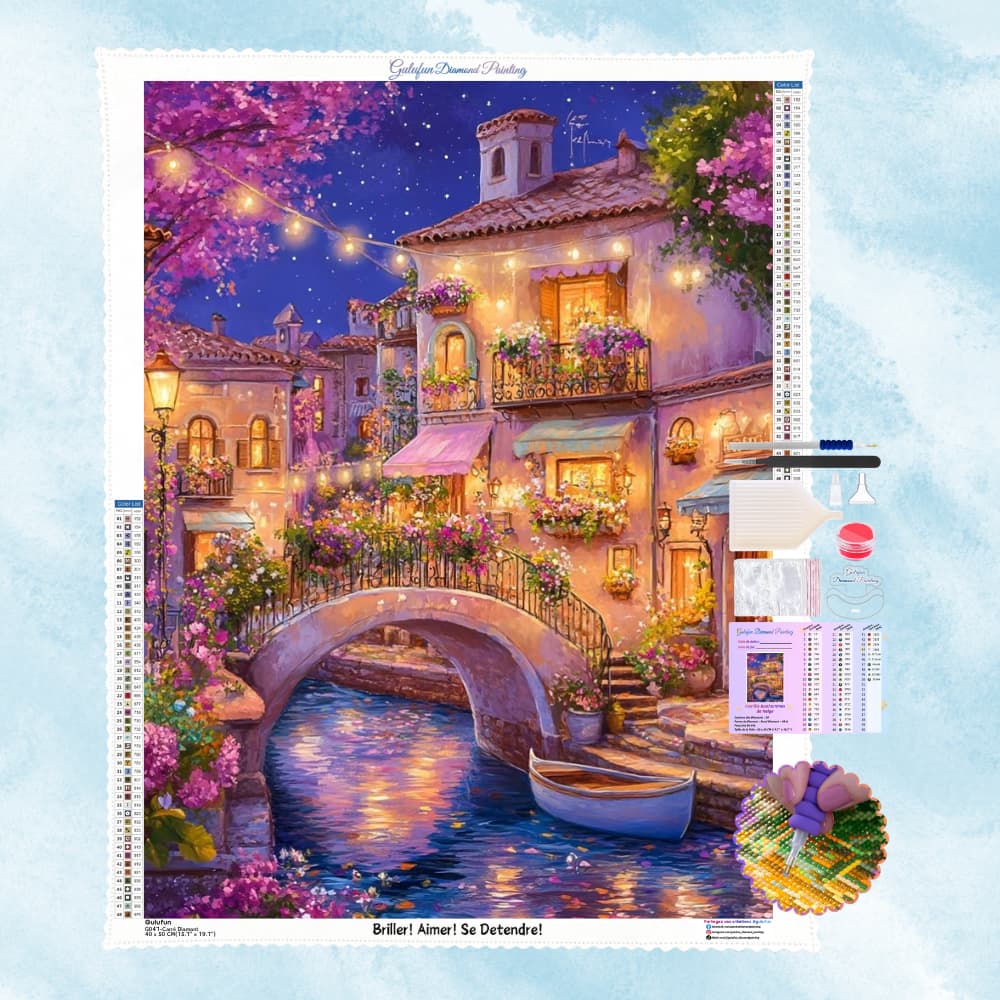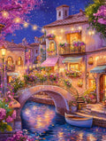 Surrounded by lights and flowers, the stone bridge is like an elegant poet standing above the waves. The river flows slowly, reflecting the tiny starlight and faint shadows. The houses on the shore are scattered in an orderly manner, and the warm light shining through the windows is a warm silhouette of life. Flowers bloom at night, emitting a faint fragrance. There is no noise here, only the tranquil beauty of the intertwining of nature and humanity. It is a haven of peace that the soul yearns to seek in the hustle and bustle of the world, allowing people to find the tranquility and poetry of life.