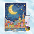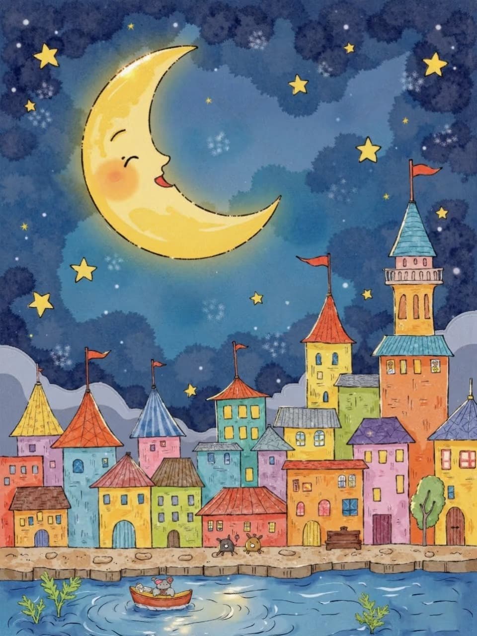 The night is deep, and the crescent moon shines with a gentle smile. The stars twinkle like scattered sparkling gems. The colorful town stands quietly under the moonlight, with its pointed-roofed houses scattered all around, as if telling an ancient and romantic story. The river flows gently, the boat rocks gently, and the whole picture is filled with fantasy and warmth, making people intoxicated by this peaceful and beautiful night dream, and their hearts are filled with endless romance and poetry.