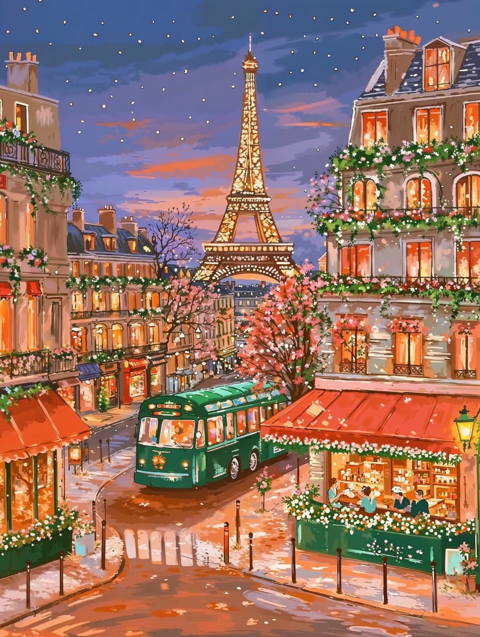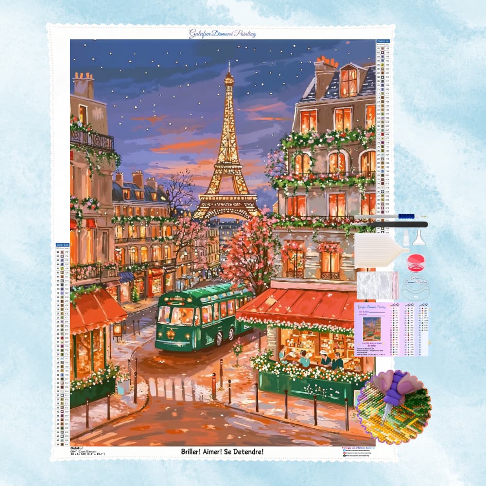 Night falls and the stars twinkle. The Eiffel Tower rises in the gloom, like a guardian of the night.