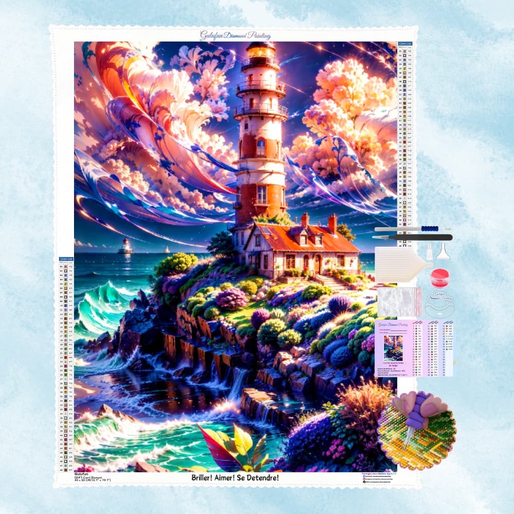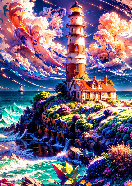 The clifftop lighthouse is flanked by a red-roofed house. Waves crash against the reefs, and the sky is full of clouds and stars, manifesting nature's magical charm.
