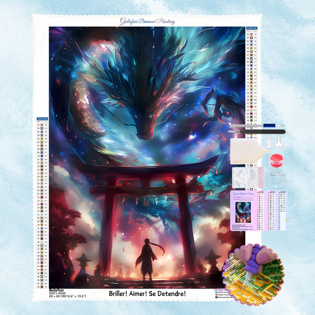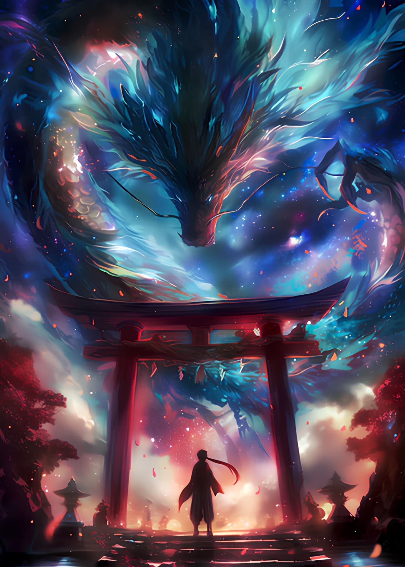 The dragon soaring under the starry sky, combined with the Japanese torii gate⛩️ and the mysterious figure, is truly amazing