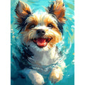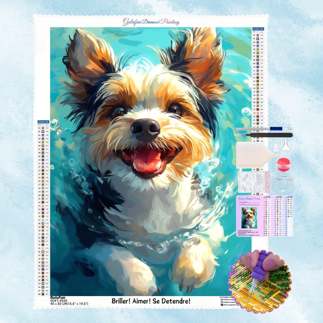 Here's a cute Yorkshire Terrier swimming. His pointy ears are charming, and his long hair ripples in the water. With a wide smile, he looks like he's having a ton of fun.