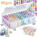 À l'intérieur de la boîte, vous trouverez 1 boîte de rangement contenant 24/60 petites bouteilles individuelles, transparentes, chacune avec un couvercle sécurisé. De plus, nous fournissons des étiquettes autocollantes pour vous aider à mieux organiser votre collection.