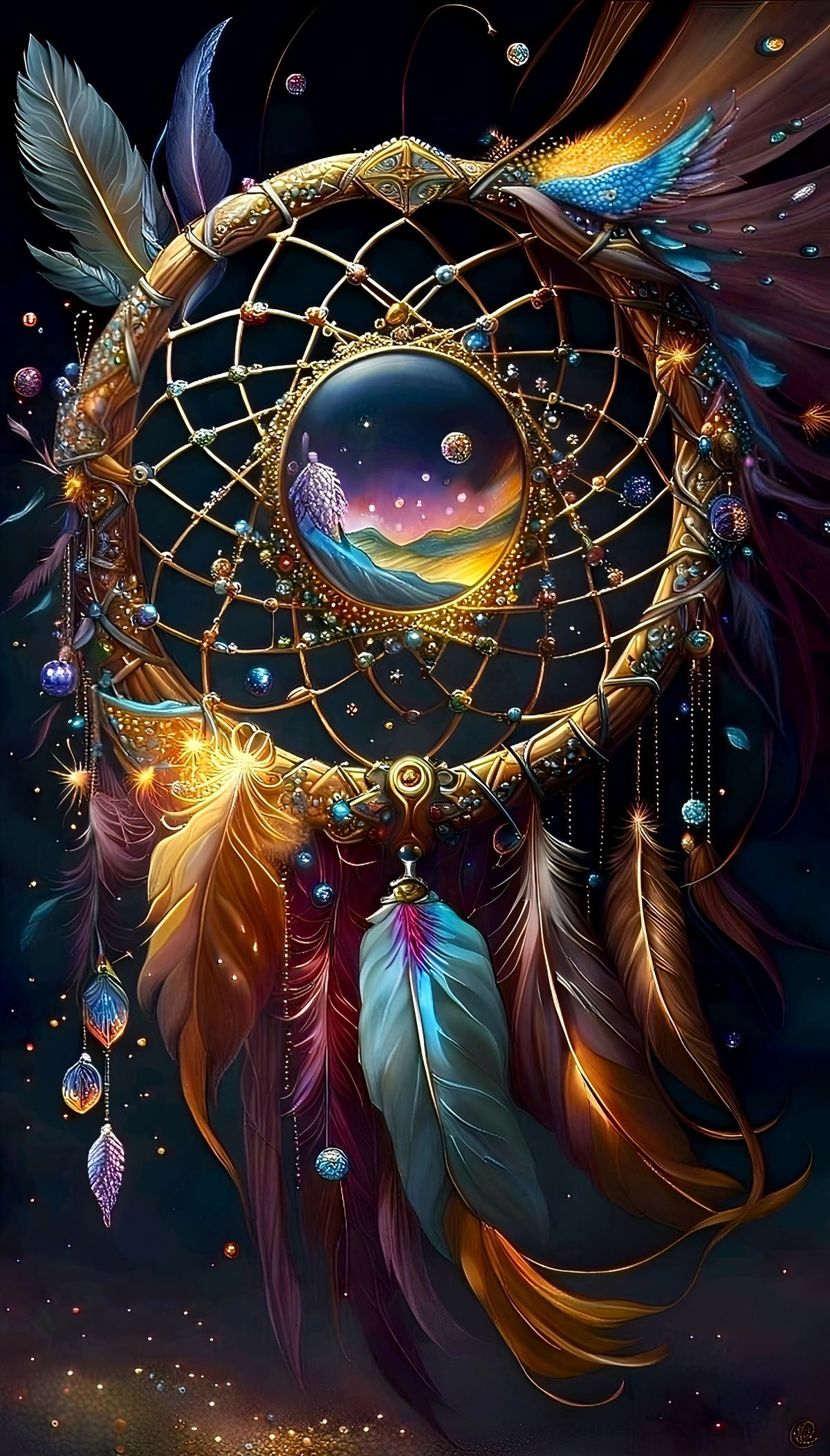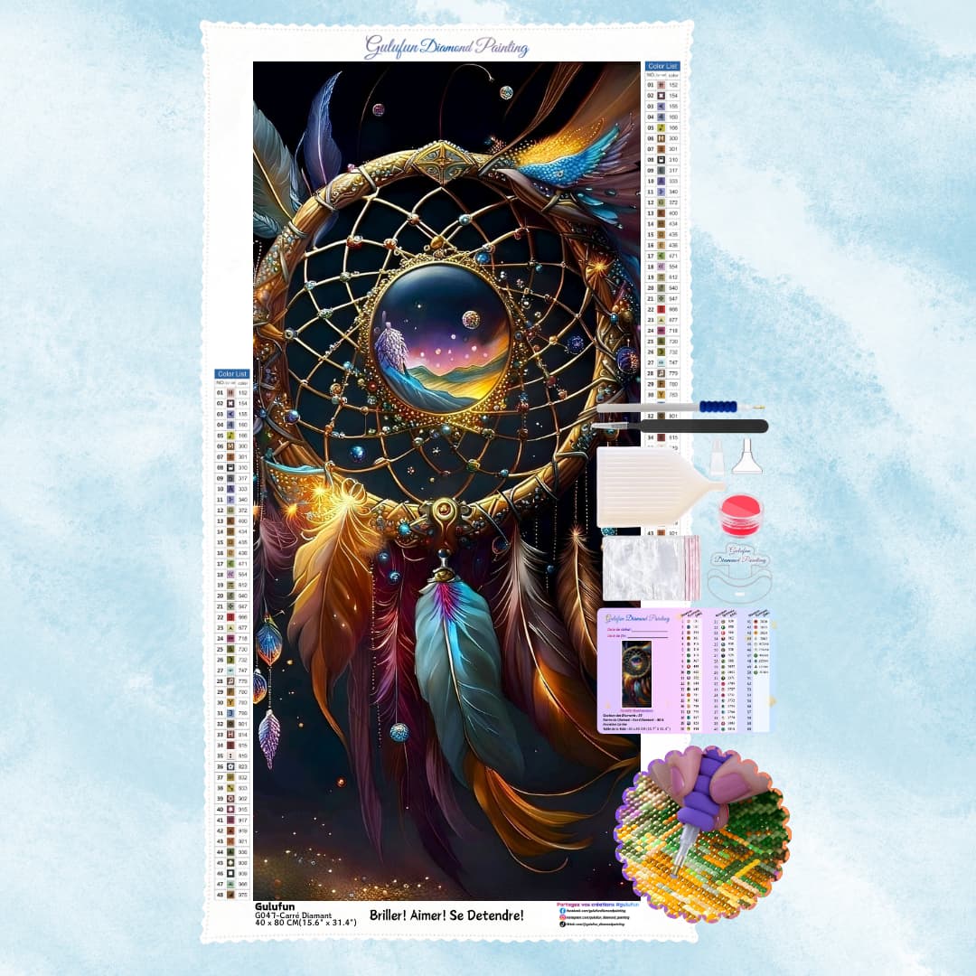 Sur fond de ciel étoilé profond,l'attrape-rêves coloré dégage une atmosphère mystérieuse.Les magnifiques motifs tissés et les perles scintillantes semblent contenir une magie inconnue qui peut conduire les gens à voyager à travers un monde fantastique entre la réalité et les rêves.