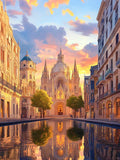 En el cielo despejado, las nubes son como seda colorida de ensueño, y el reflejo de la iglesia en el agua crea una hermosa escena.