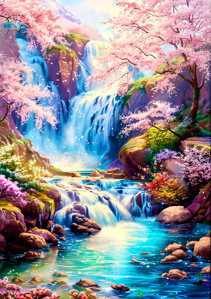 La cascade ressemble à Voie lactée et les fleurs cerisier dansent gracieusement. Les fleurs s'épanouissent à côté des pierres et les ruisseaux gargouillent.
