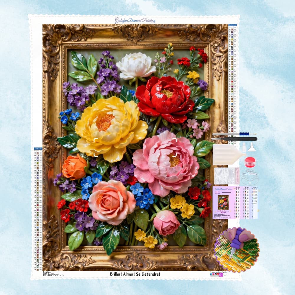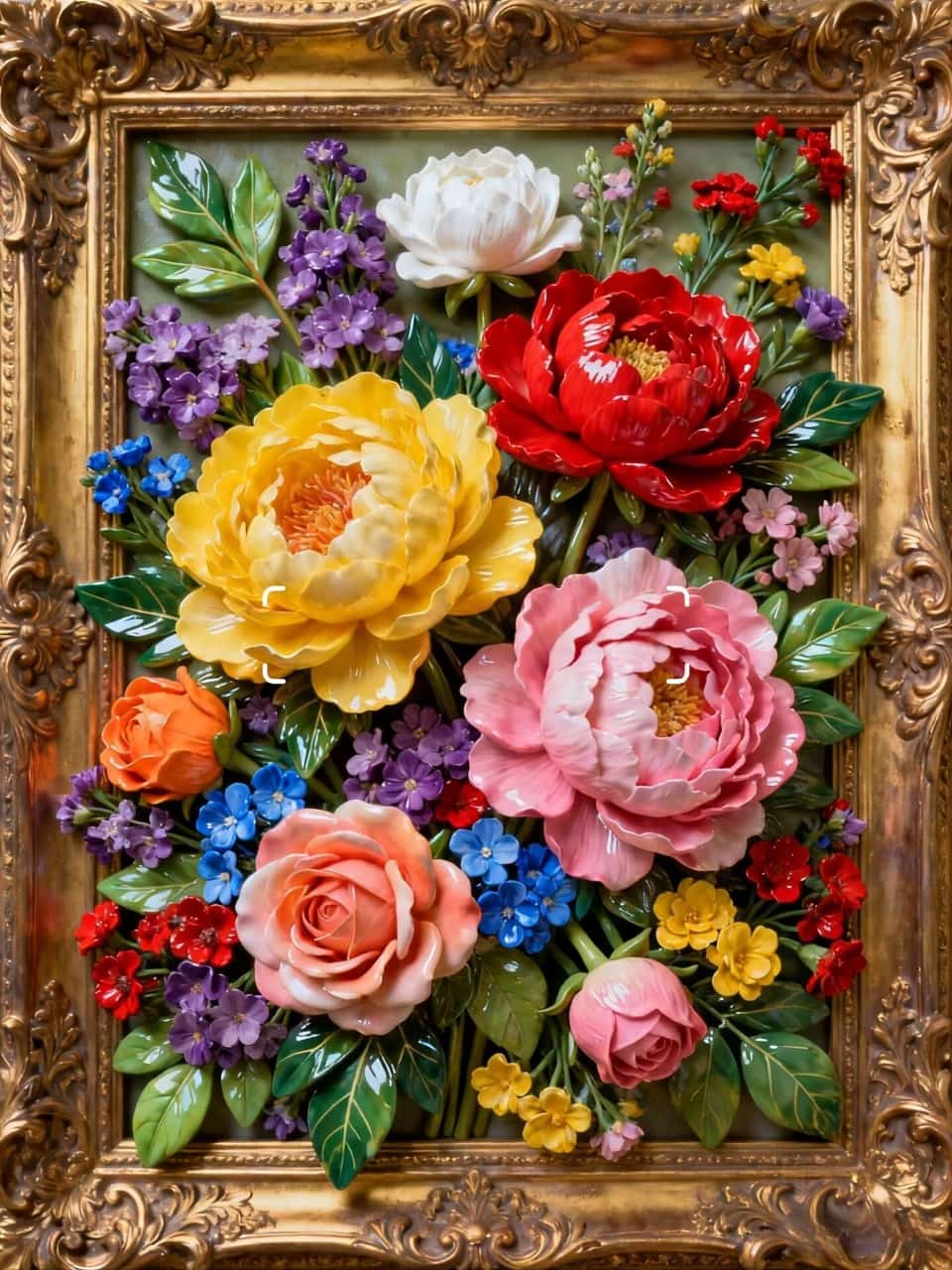 Un magnifique bouquet de fleurs en céramique, avec des pivoines et des roses aux couleurs vives, encadré dans un cadre doré richement sculpté. Chaque pétale et feuille, polis et luisant, crée une œuvre d’art tridimensionnelle exquise.