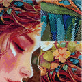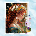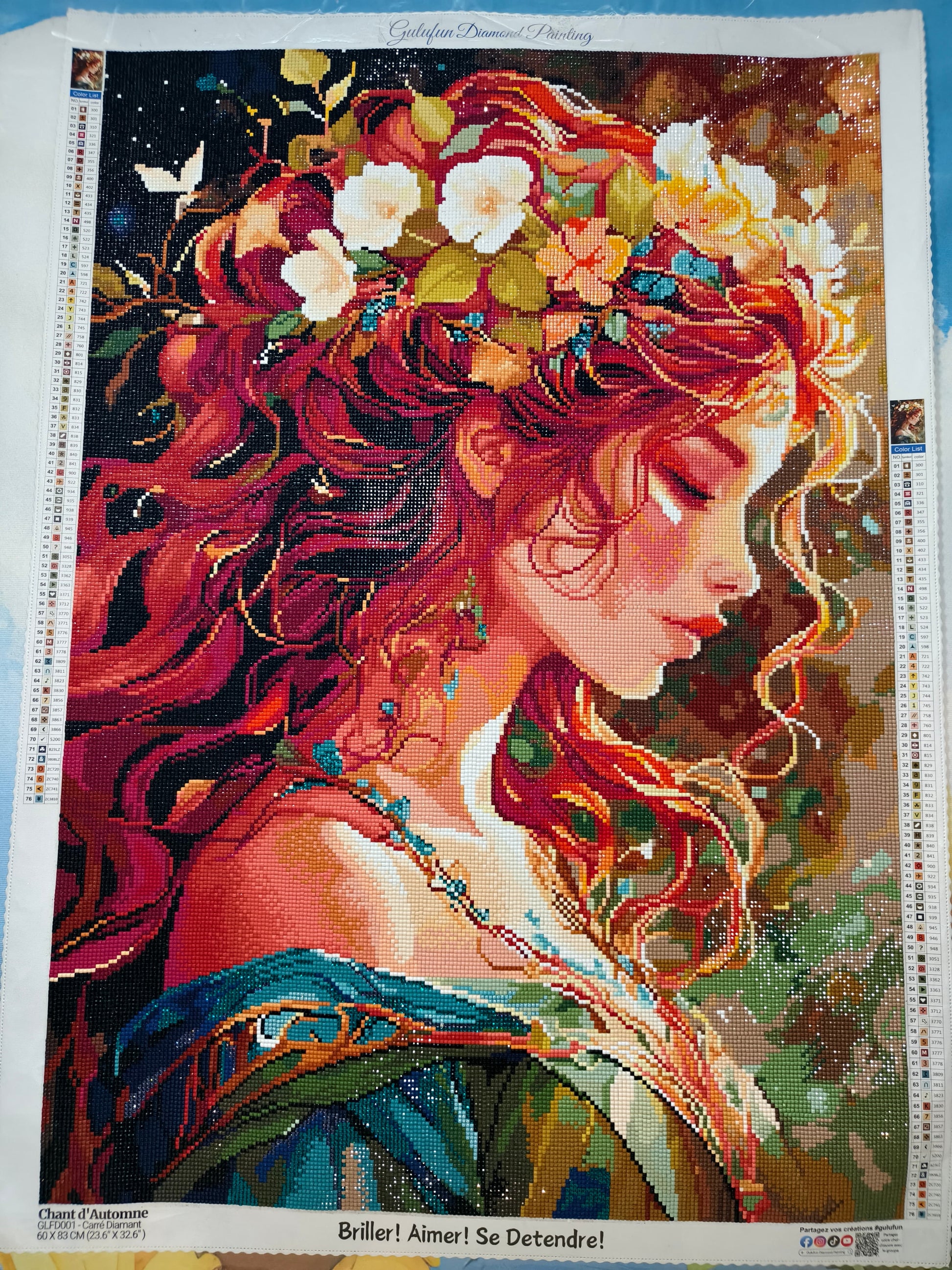 Laissez-vous séduire par la Broderie Diamant Chant d'Automne, mettant en scène une femme élégante aux boucles auburn et parée d’un délicat headpiece fleuri.