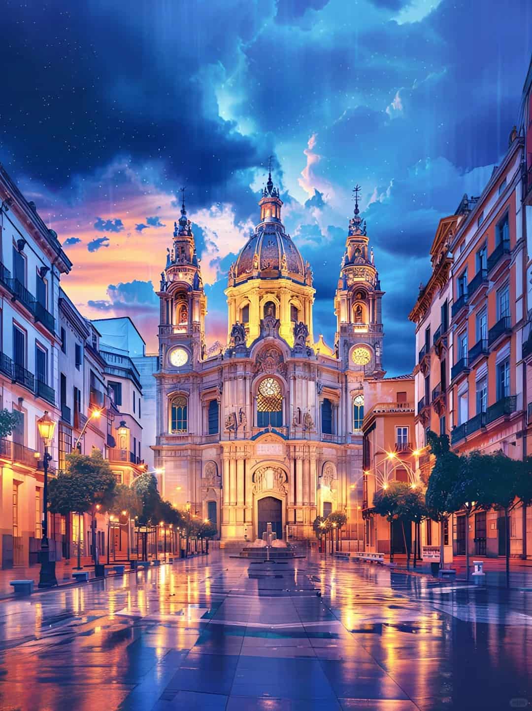 La cúpula y la aguja apuntan directamente al cielo estrellado, exudando una atmósfera sagrada y encantadora bajo el entrelazamiento de las nubes y la luz de la luna. La cálida luz amarilla se desborda desde el interior del edificio, contrastando con el camino de piedra húmeda, como si contara la piedad y las historias del pasado.