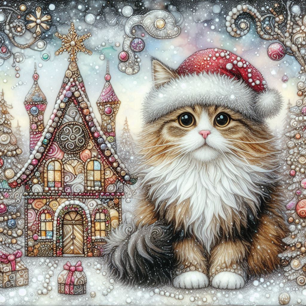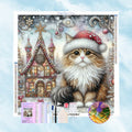 Le chat tout en fourrure porte un bonnet de Père Noël rouge et a de grands yeux mignons.À côté de lui se trouve une maison de rêve décorée de bijoux,et le cadeau contient une surprise de vacances.