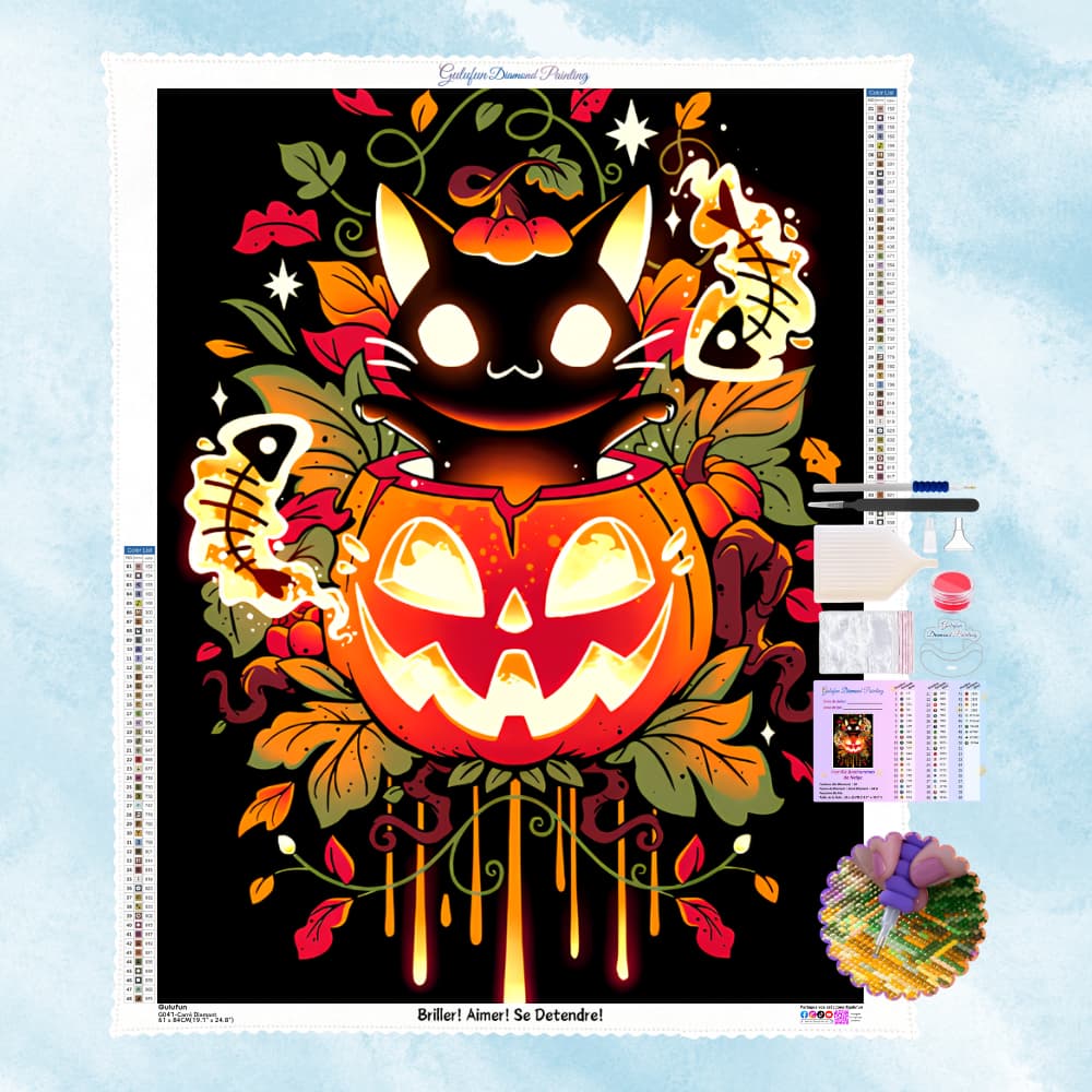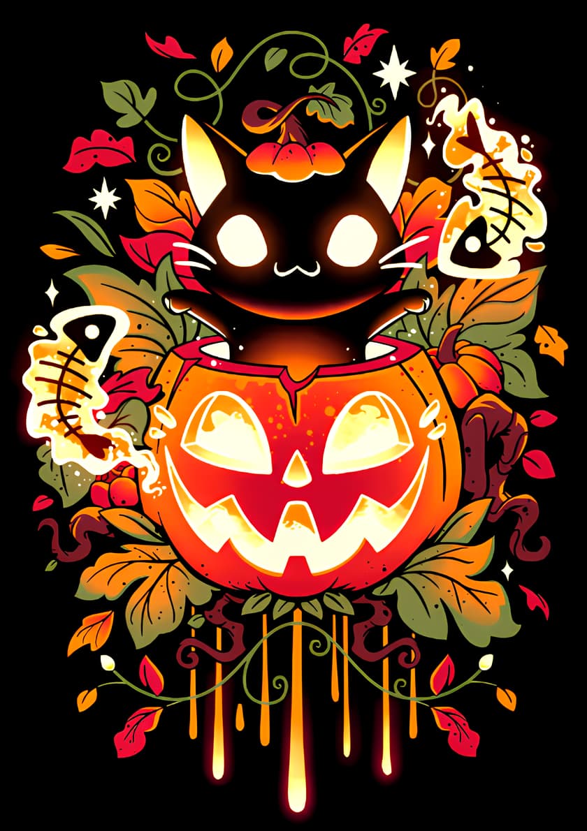 Chat noir mignon dans une citrouille illuminée, entouré de feuilles d’automne et d’os de poisson flamboyants, style graphique coloré.