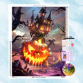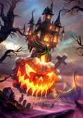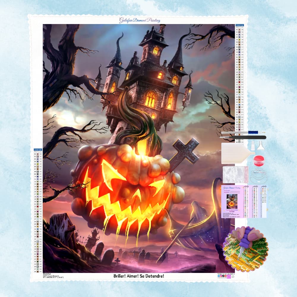 Château hanté sur une grande citrouille grinçante, dans un cimetière avec arbres morts. Ambiance sombre et mystérieuse.