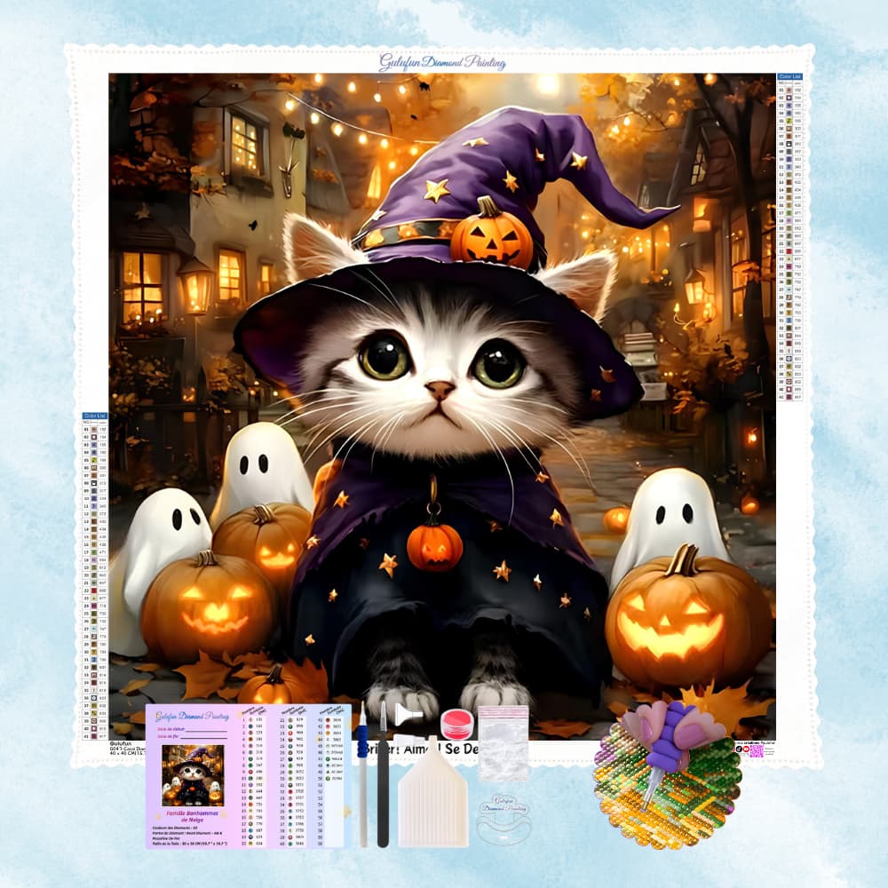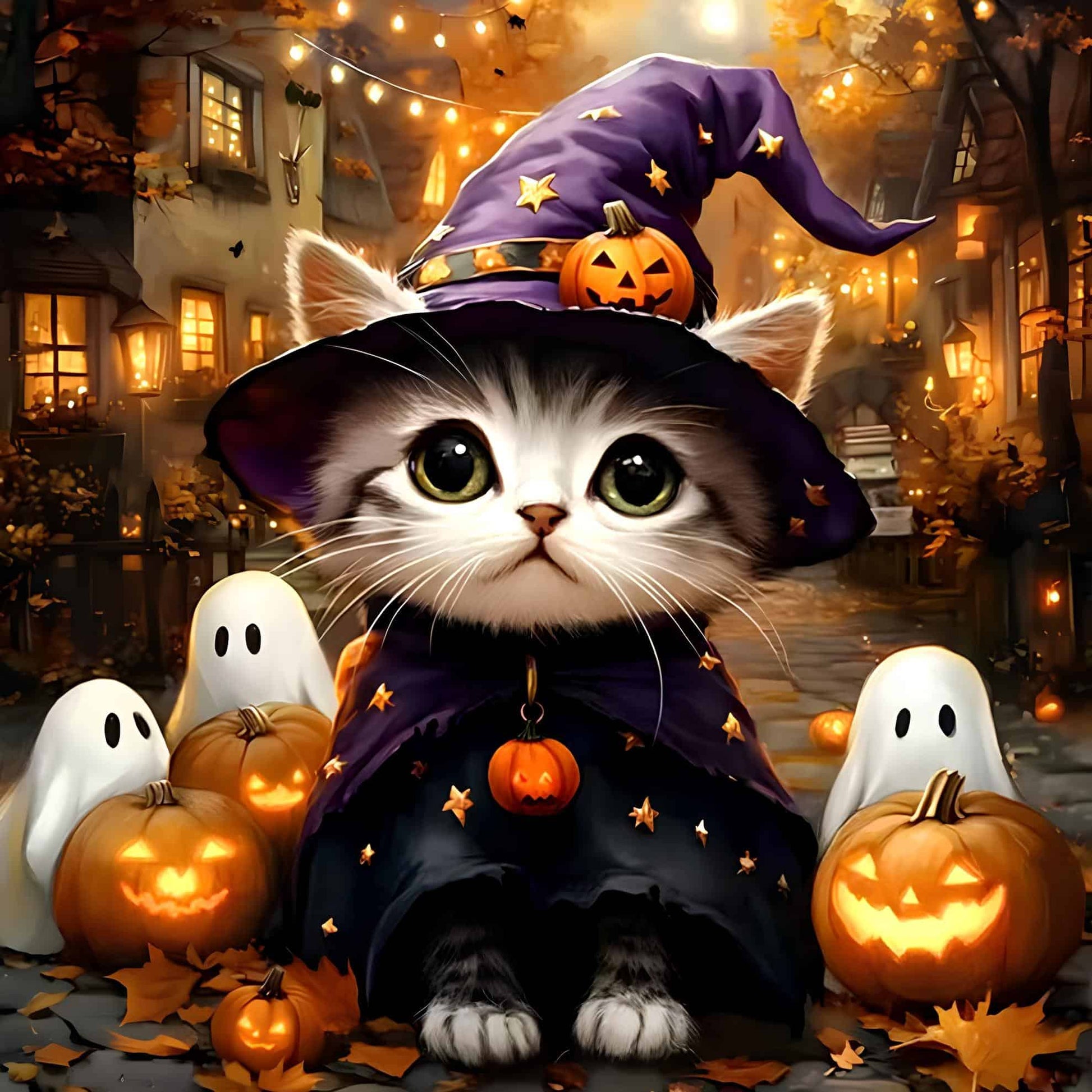 Un chaton de Halloween trop mignon, avec un chapeau de sorcier, entouré de citrouilles et de fantômes dans une ruelle lumineuse. Ambiance magique et festive ! 🎃🐱
