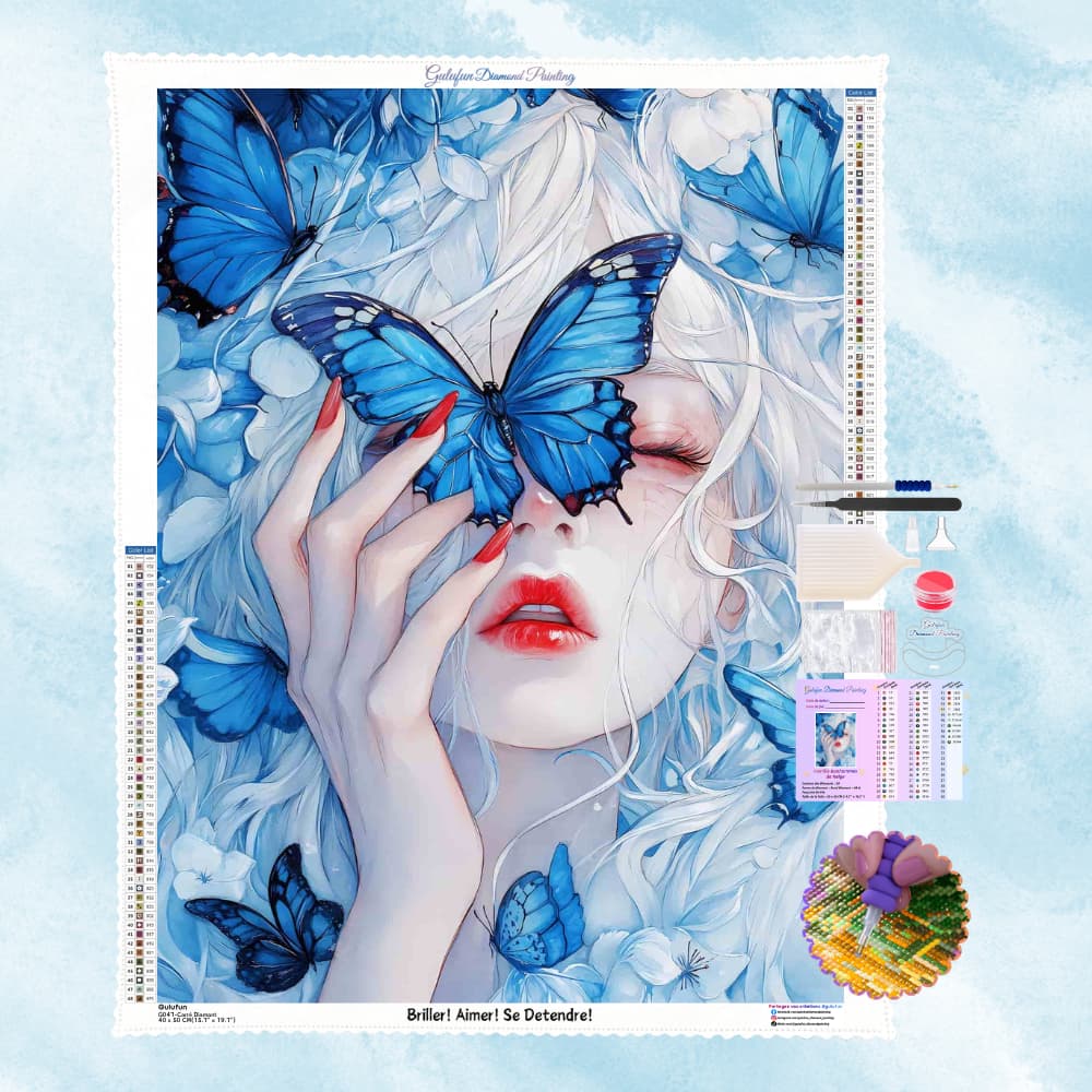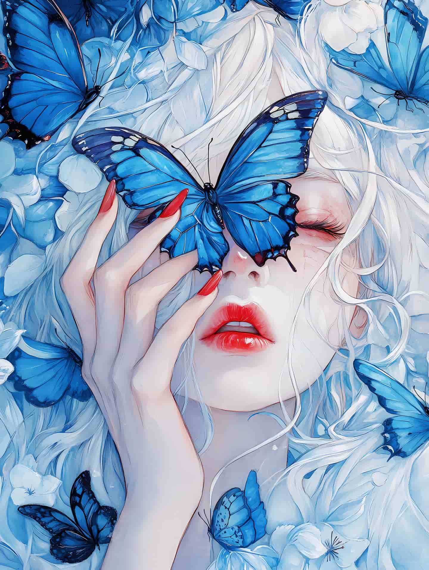 La mujer cierra los ojos, roza suavemente las alas de la mariposa con las yemas de los dedos, y sus uñas y labios rojos se funden con los tonos azules y blancos, pintando un poema sobre los sueños y la naturaleza.