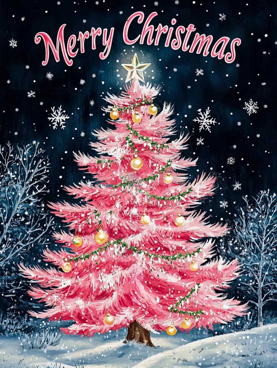 The Christmas tree, all wrapped in pink snow, looks like it’s slathered in frosting!