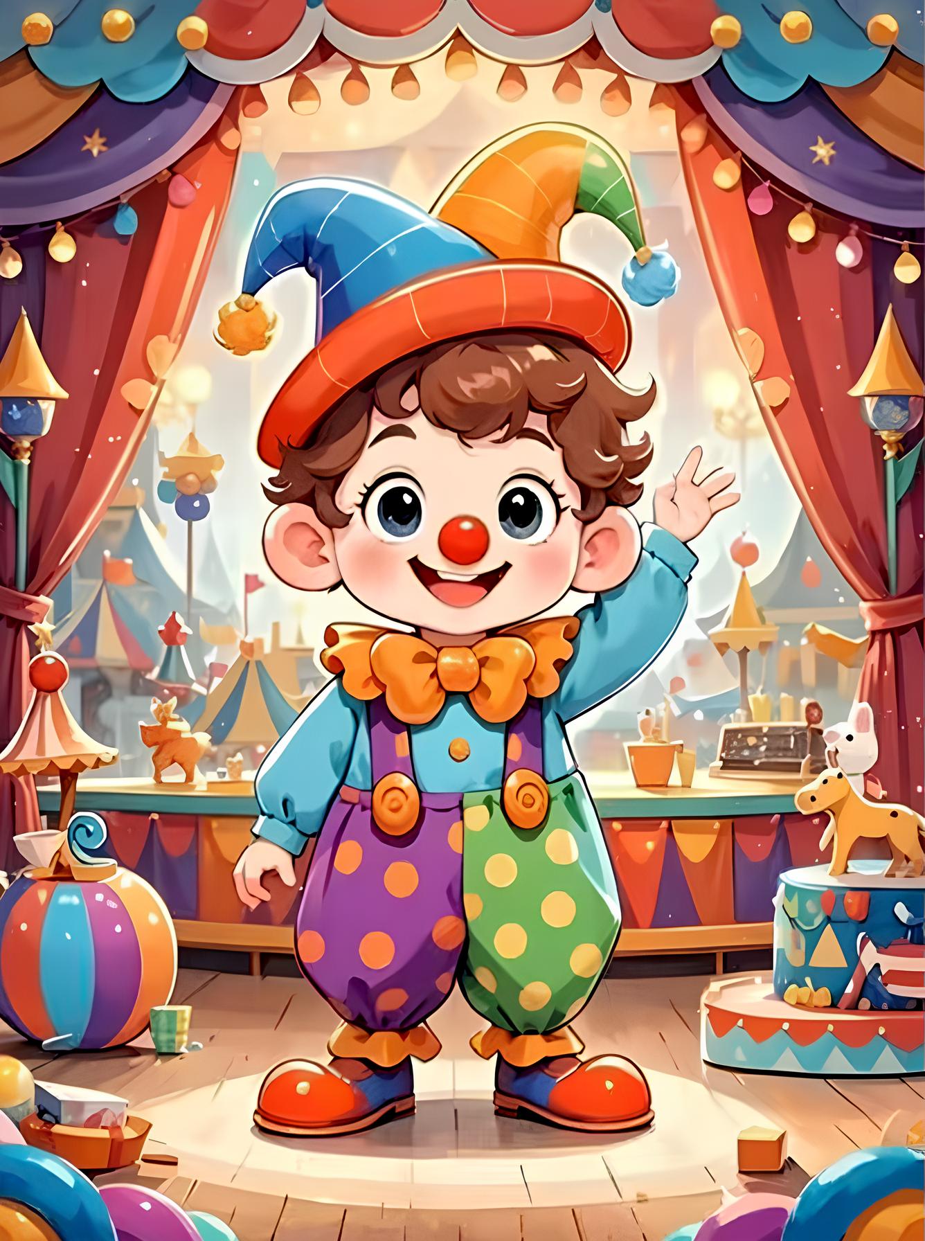 La magie du cirque, sous forme d’œuvre d’art! 🎪✨ Ce clown joyeux et la scène de carnaval vibrante sont trop mignons.