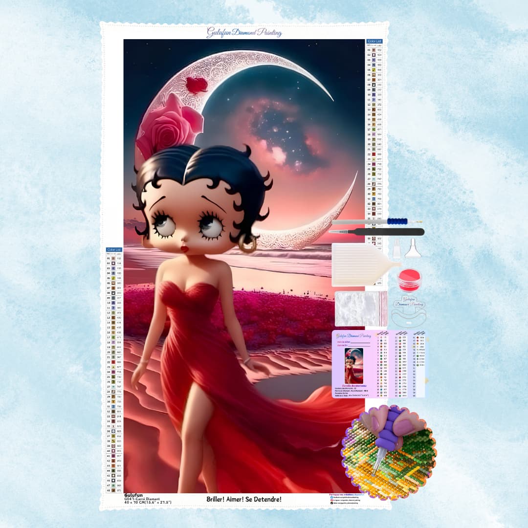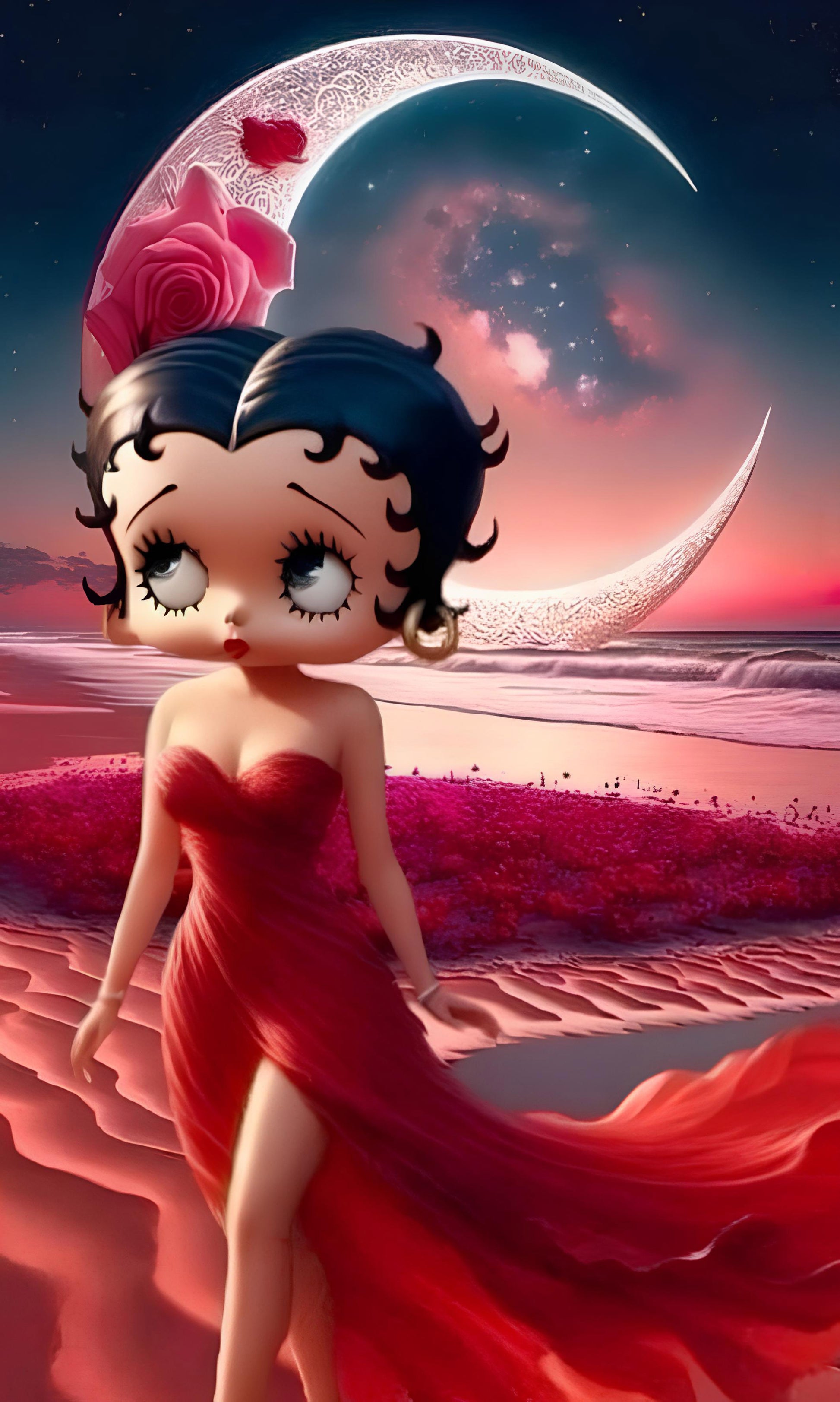 La robe rouge de Betty Boop se balance,comme un messager mystérieux sur la plage rose,chuchotant aux étoiles et aux vagues.