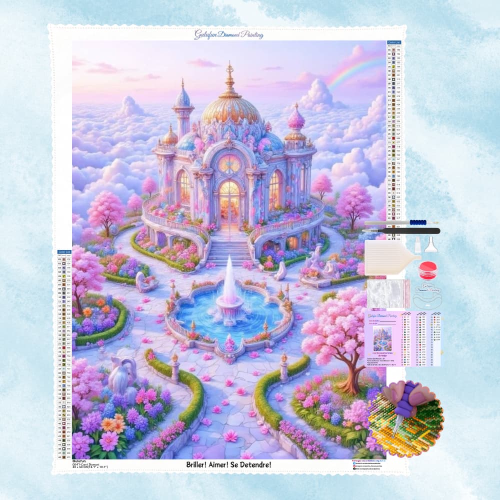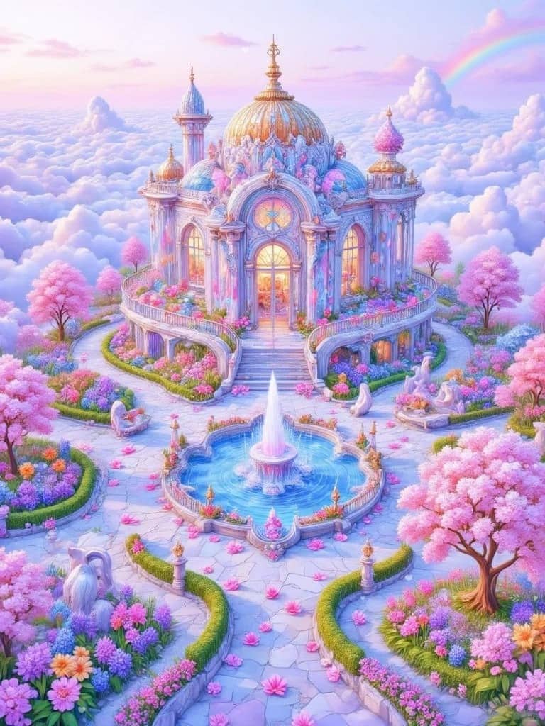 The pink and blue tones, flowers, trees and fountains, every detail is sparkling with dreamy light.