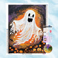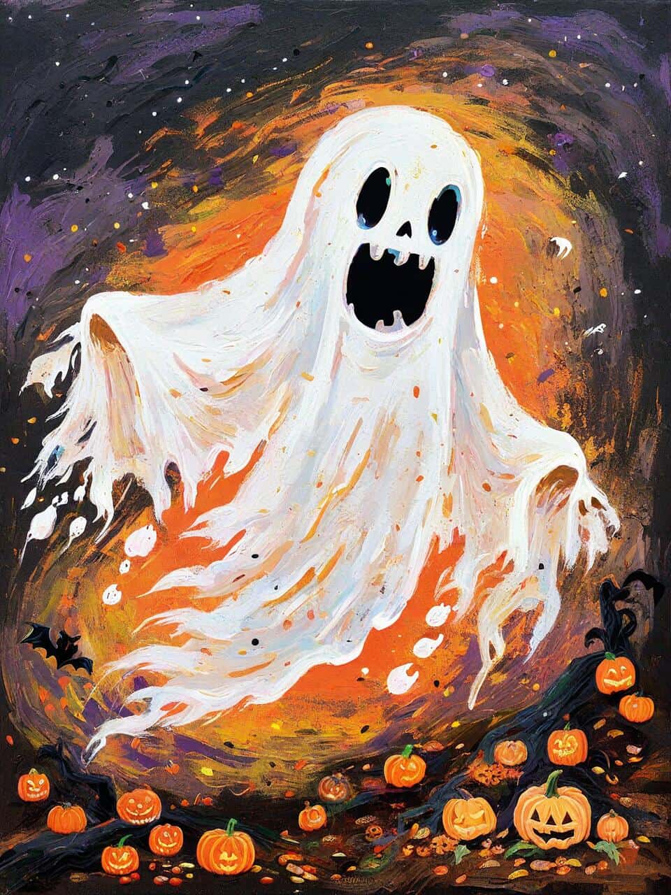 Fantôme blanc expressif avec citrouilles grinçantes et chauves-souris, sur un fond abstrait coloré, style peinture.