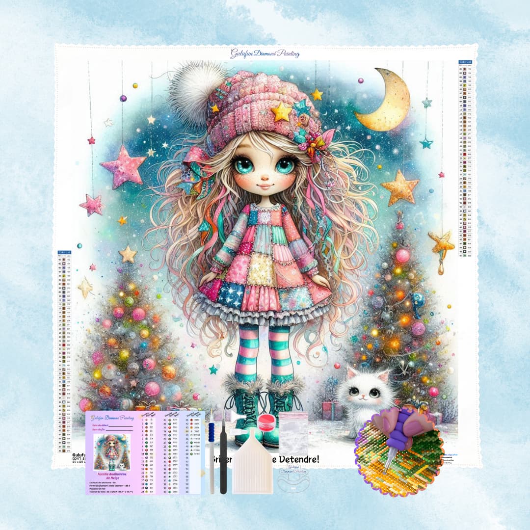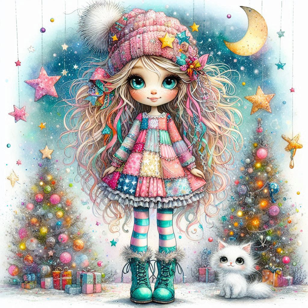 L'arbre de Noël scintille,les cadeaux s'entassent en une jolie colline,le chaton tient compagnie à la fille et l'ensemble est plein d'innocence enfantine,comme si vous étiez entré dans un monde de conte de fées de rêve qui n'appartient qu'aux filles.