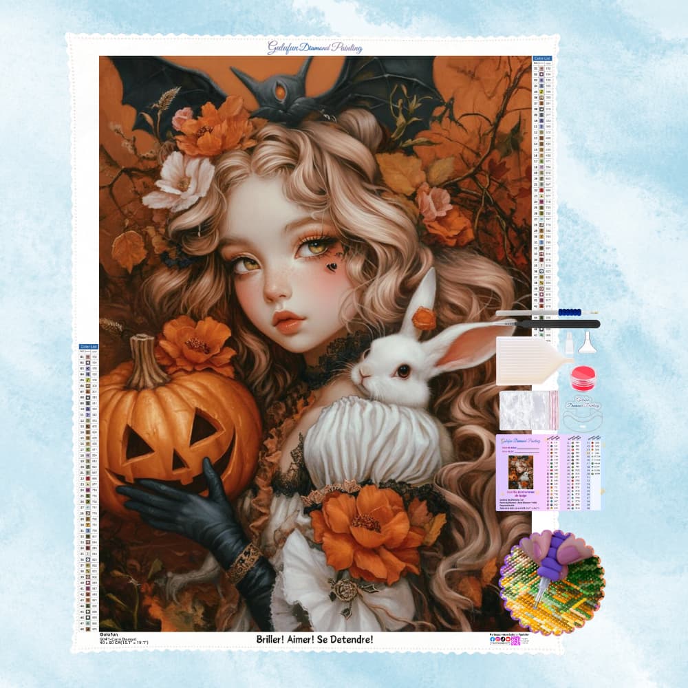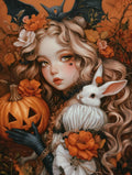 Une jeune fille aux cheveux blonds bouclés, tenant une citrouille hantée et accompagnée d’un lapin blanc, décorée de fleurs d’automne et d’une chauve-souris noire. Un mélange de douceur et d’atmosphère Halloween enchantée.
