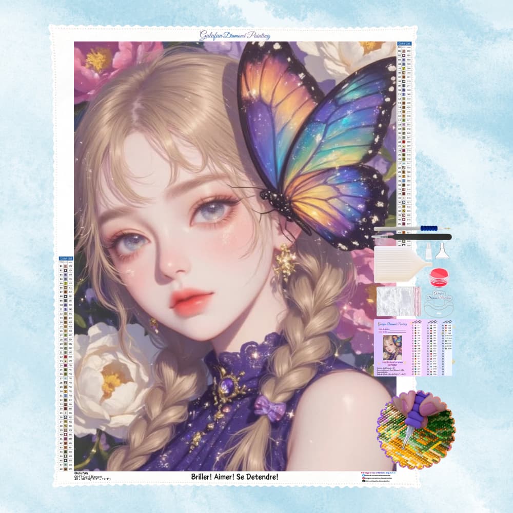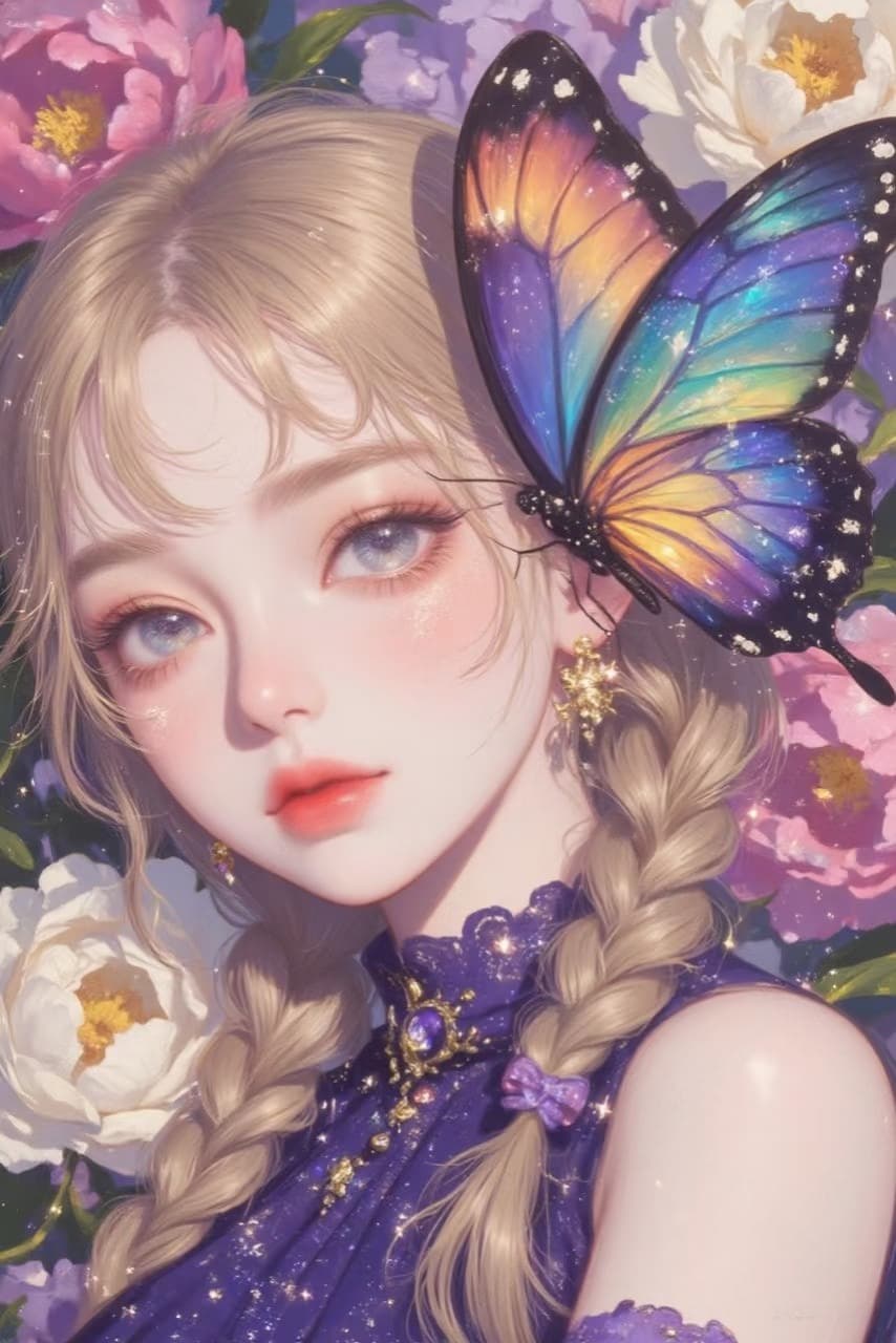 La fille est comme une fée dans un rêve, et ses tresses dorées sont comme des rubans tissés au clair de lune. La robe violette dégage une lueur mystérieuse, qui contraste magnifiquement avec les papillons colorés sur ses épaules. Les fleurs en arrière-plan ressemblent à des nuages dans le ciel, et l'ensemble de l'image est enveloppé d'un halo de rêve, transmettant une conception artistique éthérée et magnifique, comme s'il s'agissait d'un fragment capturé d'un rêve dans les nuages.