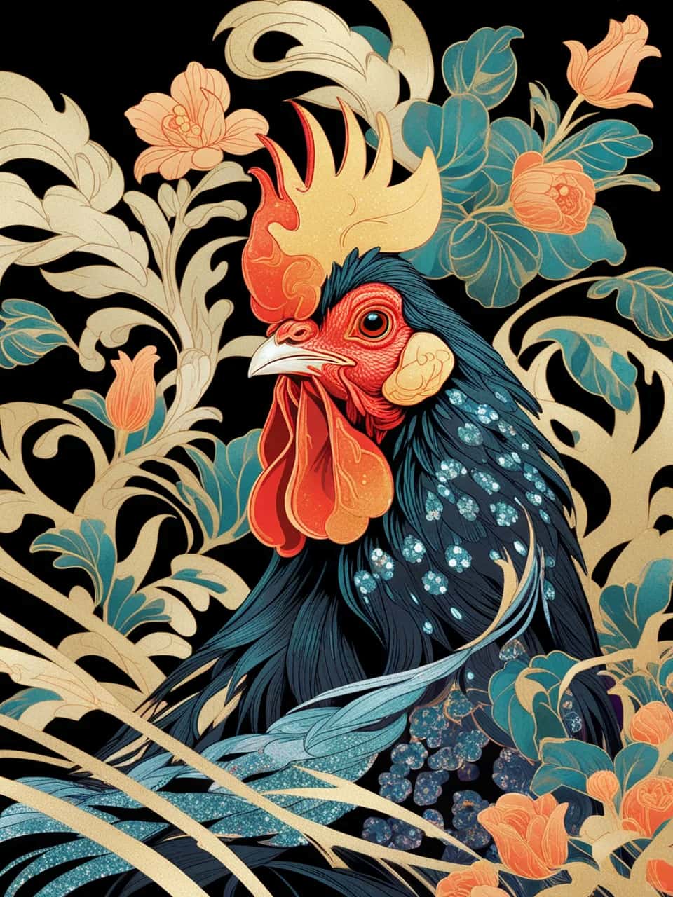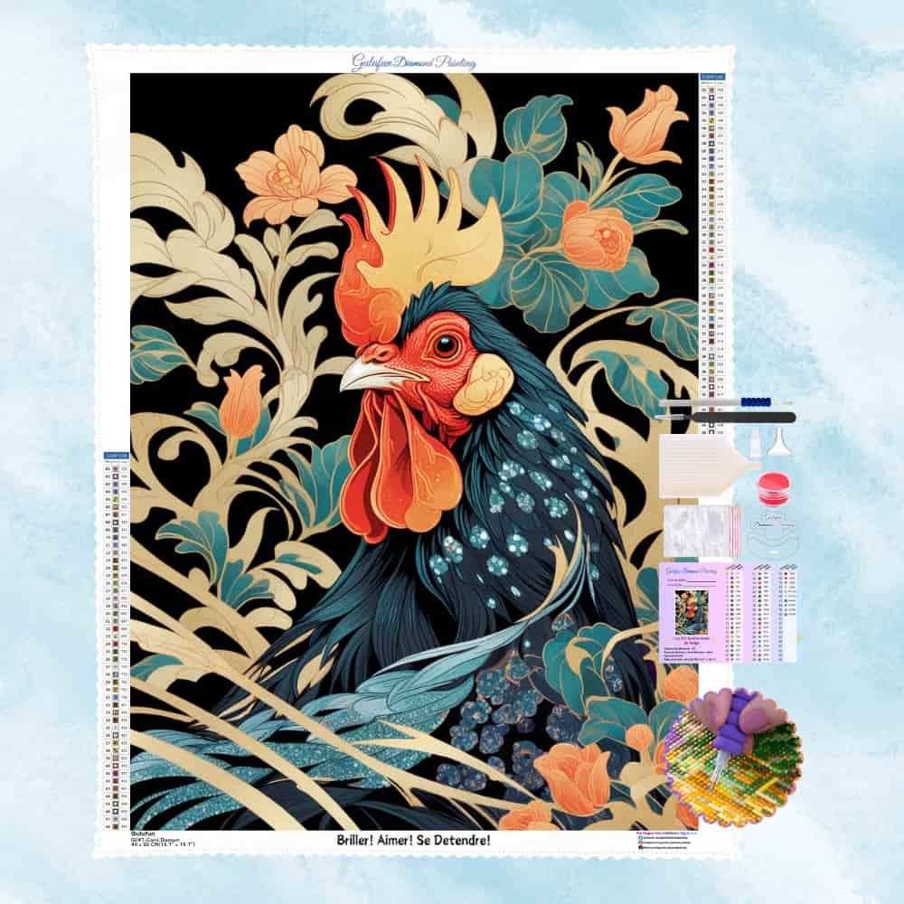 La postura del gallo y los motivos florales que lo rodean están llenos de elegancia clásica.