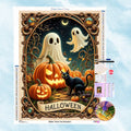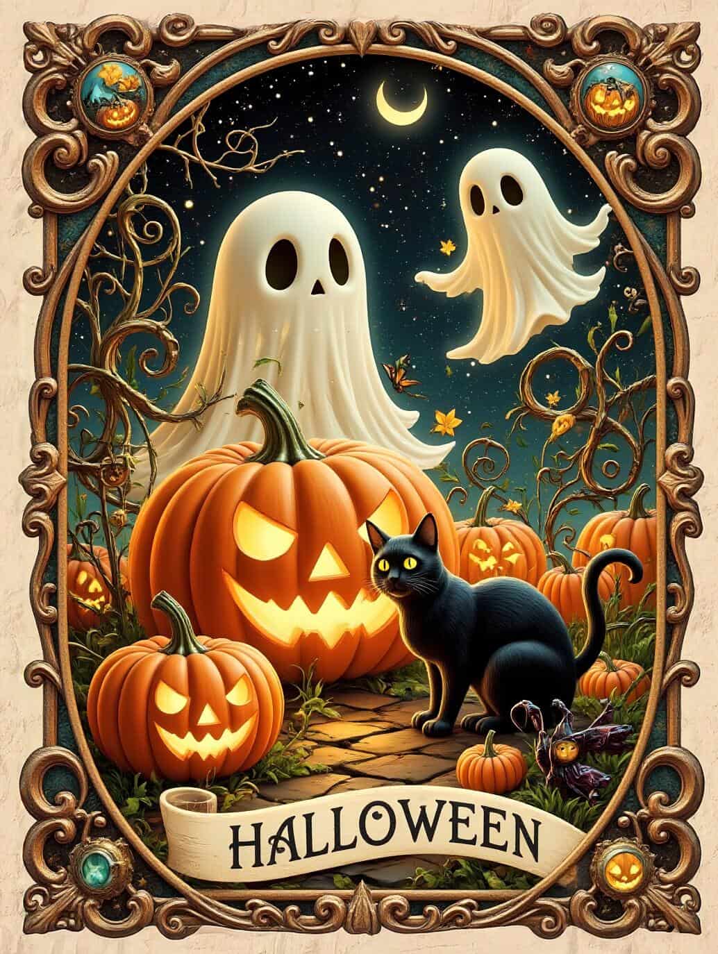 Deux fantômes flottants, de grandes citrouilles hantées et un chat noir mystérieux, tous dans un cadre doré vintage sous une lune de crépuscule. Une scène classique et enchantée d’Halloween.