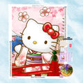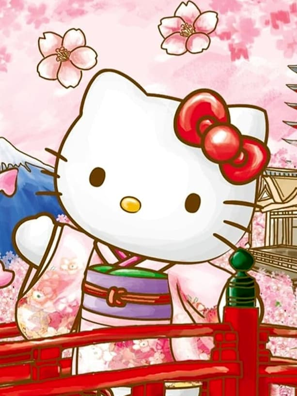 Hello Kitty ressemble à un adorable protagoniste de conte de fées, évoluant dans un paysage féerique de cerisiers en fleurs roses, son kimono ressemblant à une magnifique robe de cérémonie ensorcelée.