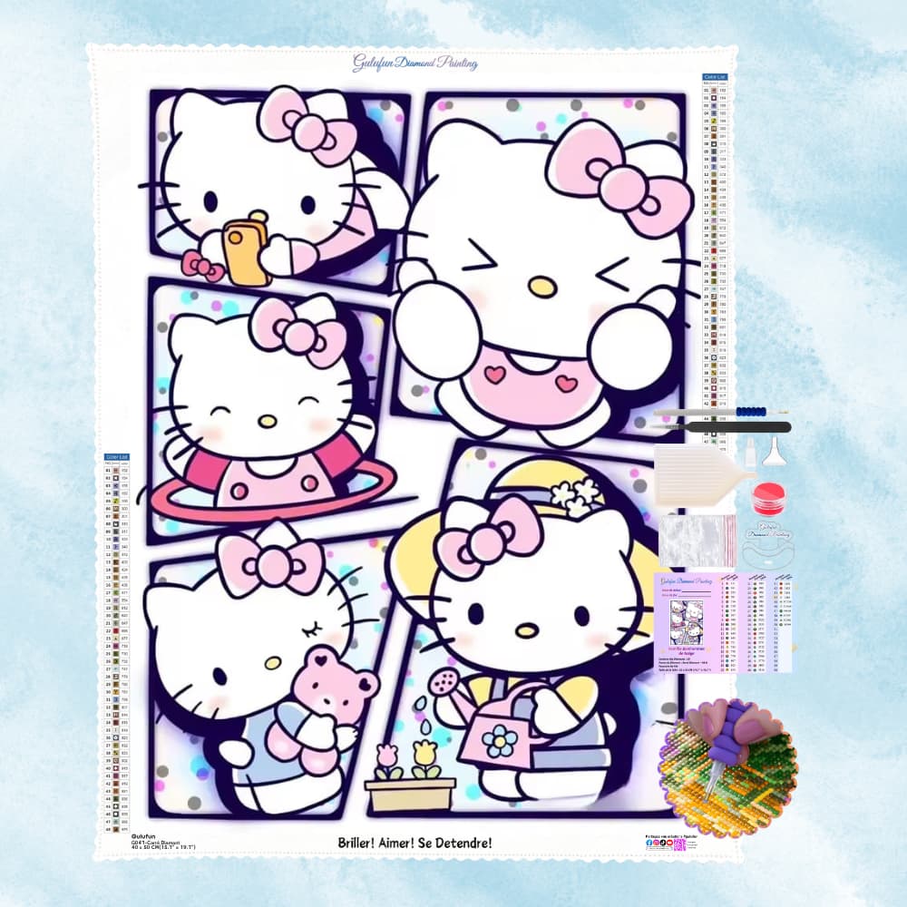 Dans plusieurs petites scènes, Kitty tient le téléphone dans les mains, comme s’elle partageait des anecdotes amusantes avec ses amis ; puis elle plisse les yeux et fait la hulahoop joyeusement ;