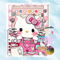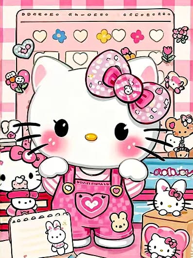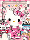 L’arrière - plan à damier rose ressemble à la page intérieure d’un carnet de notes rétro, et la salopette ainsi que le grand nœud papillon de Kitty ont tous un style de design mignon rétro ; les petites peluches environnantes, les notes de lapin avec un effet de dessin manuel, ainsi que des cœurs et des fleurs décoratifs...