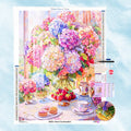 Dans un vase transparent, les hortensias éclatants, aux couleurs vibrantes et aux couches distinctes, dévoilent la texture des pétales et le vert vibrant et texturé des feuilles.