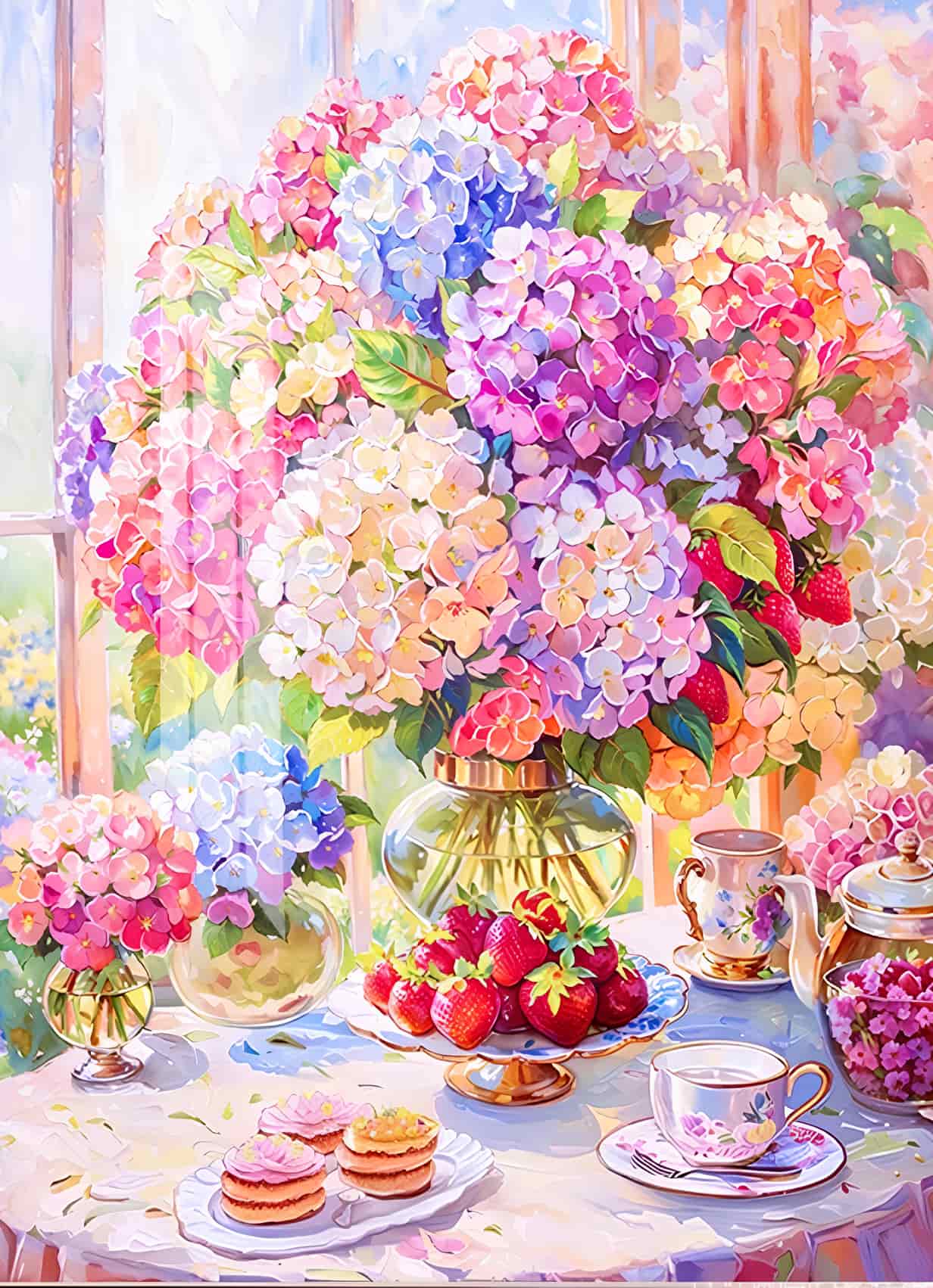 Le service à thé raffiné, avec ses motifs délicats et ses pâtisseries alléchantes, crée une sensation de réalité immersive et tangible.