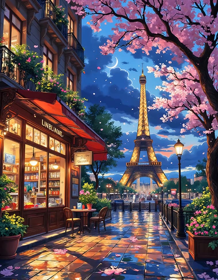 Dans la nuit de Paris, les cerisiers en fleurs s'entremêlent tendrement avec la Tour Eiffel. La lumière chaude du petit magasin se répand sur les pétales, et même l'air est imprégné de romance.