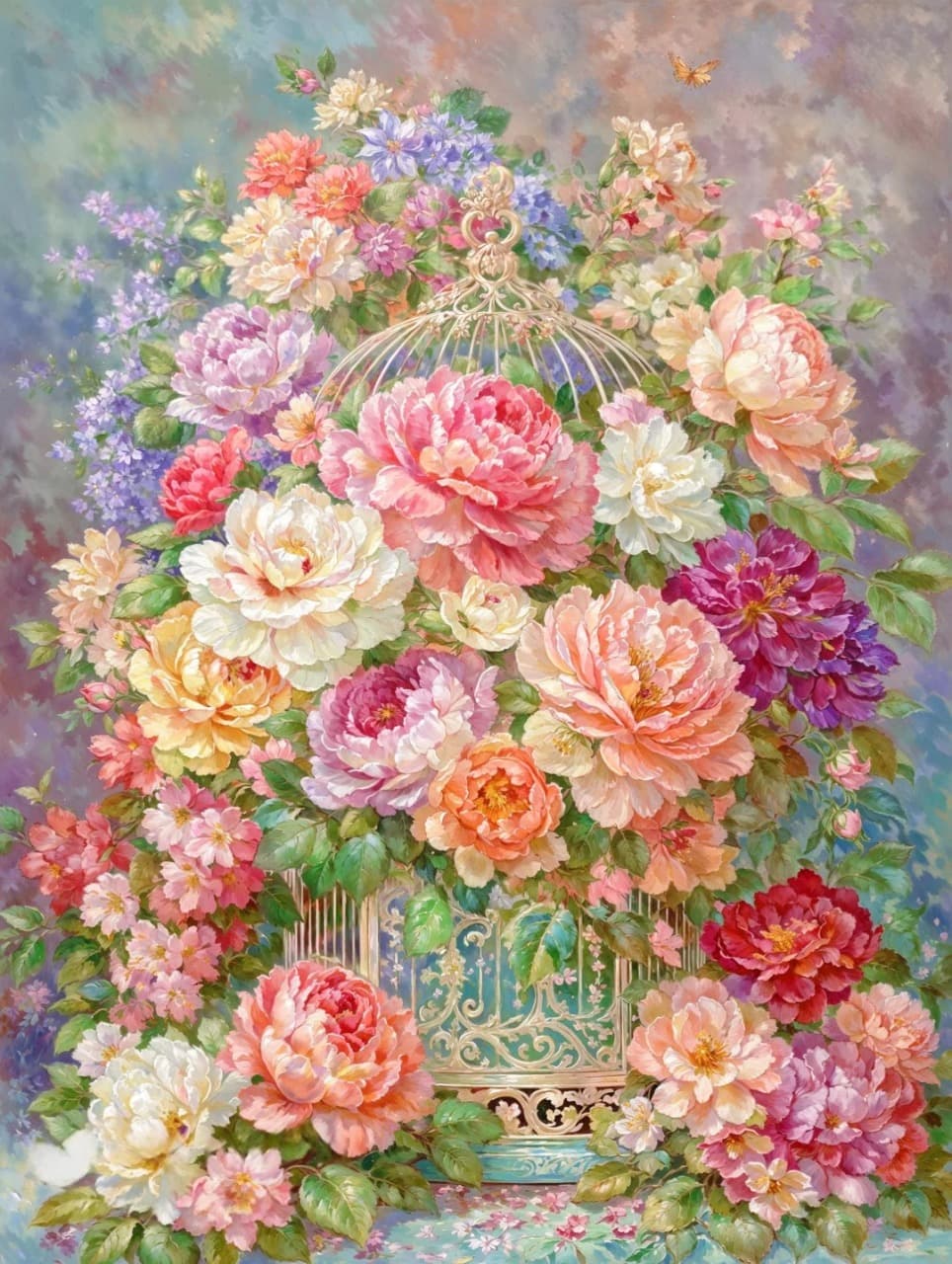 Des grappes de fleurs fleurissent librement autour de la cage à oiseaux exquise, et des couleurs colorées s'entremêlent dans une image magnifique.