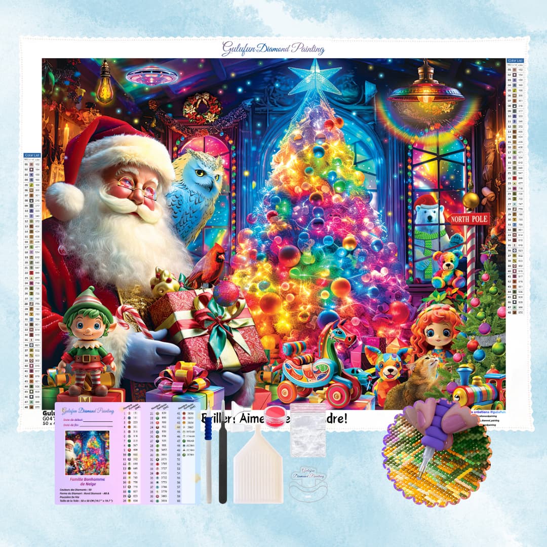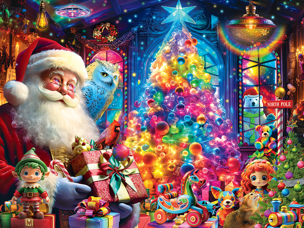Un sapin aux couleurs de l'arc-en-ciel étincelant, le Père Noël portant ses précieux cadeaux, le tout entouré d'un joyeux amoncellement de jouets multicolores.