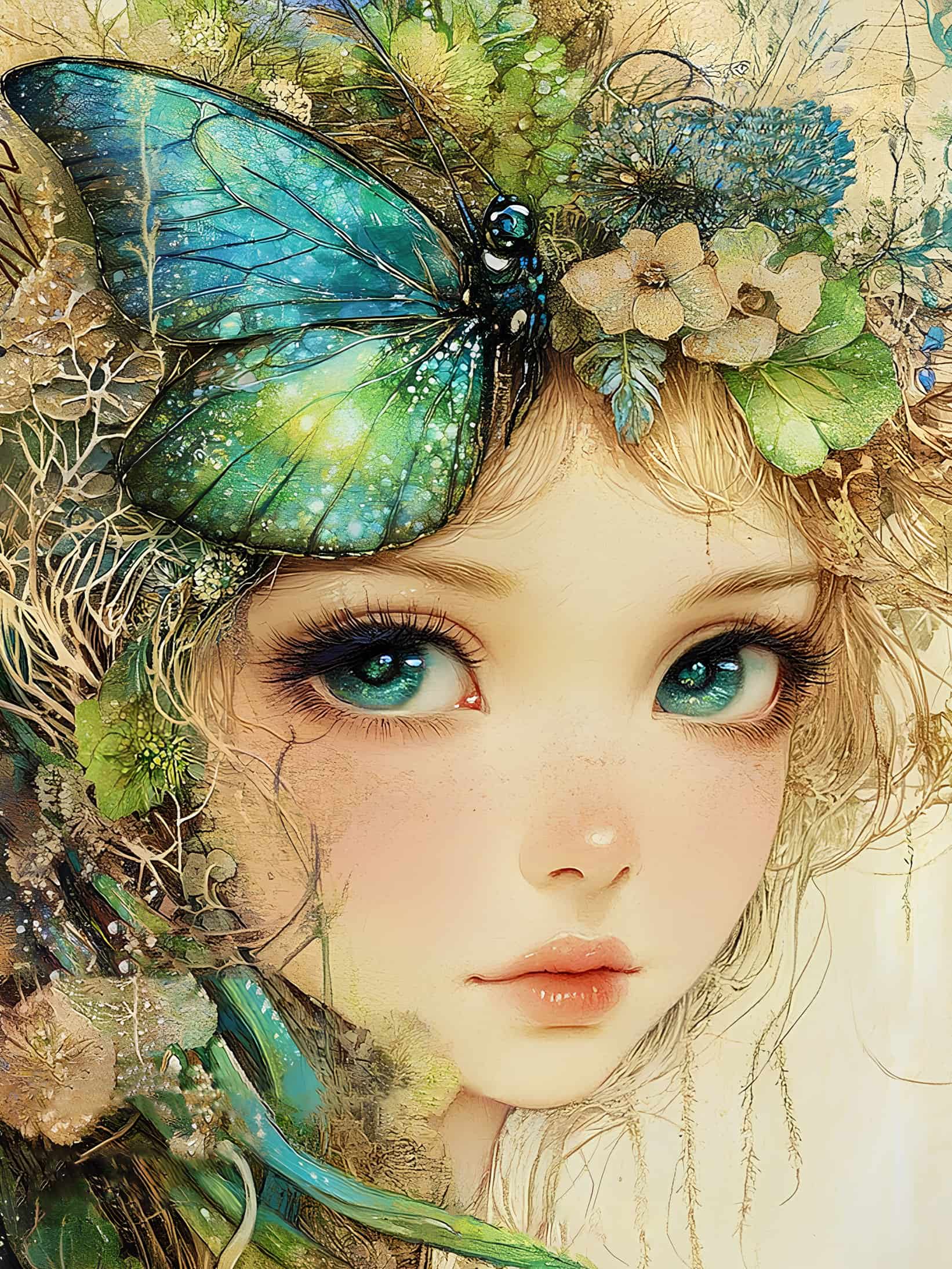 When the blue butterfly lands on the tip of her hair and embraces the flowers and plants, her eyes flow like a spring, telling the gentle secrets of nature.