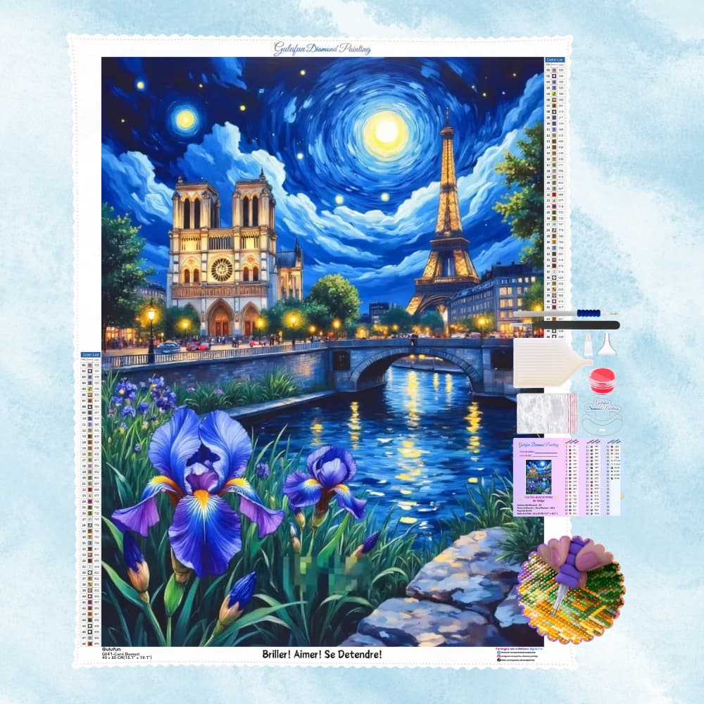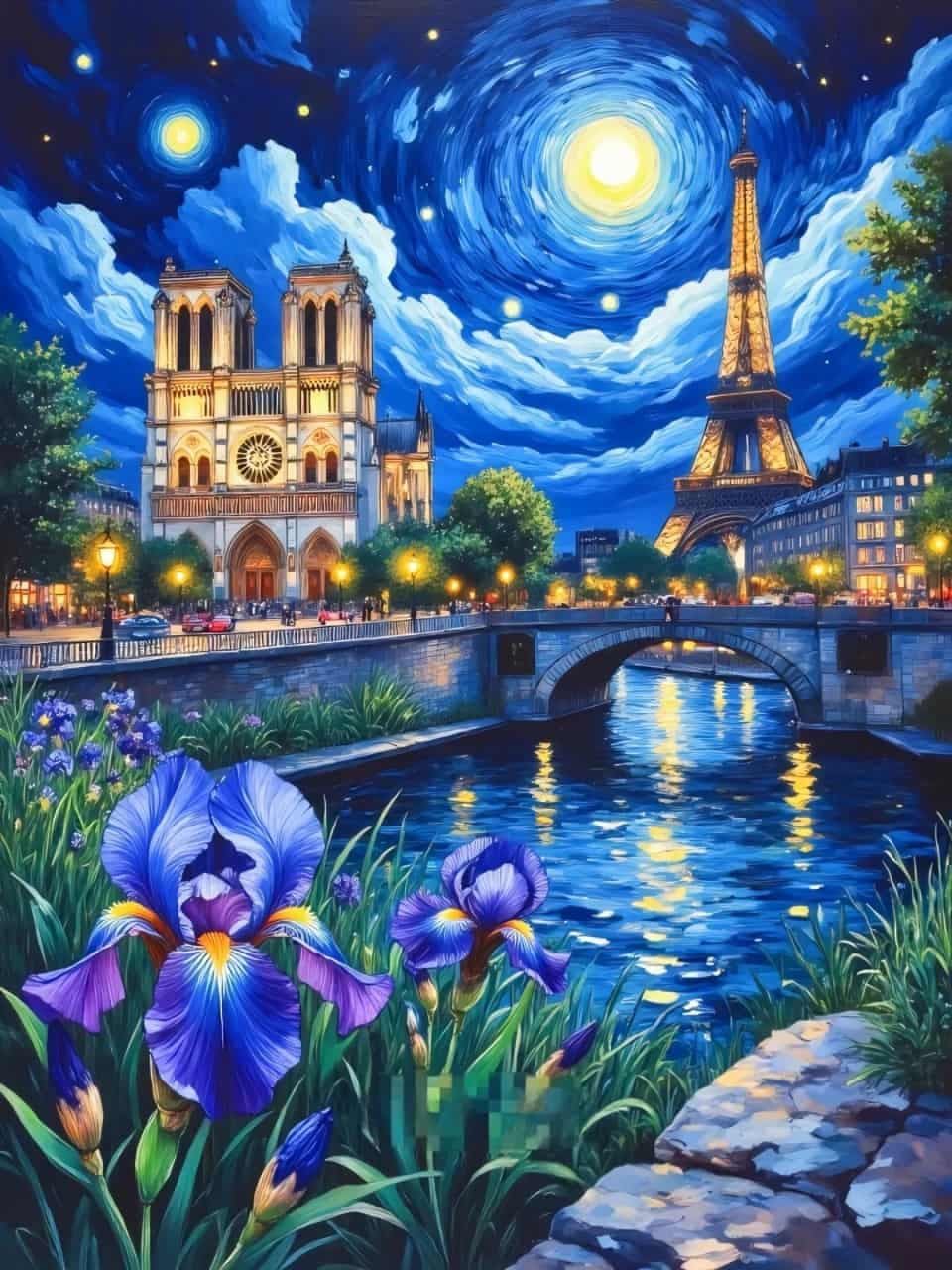 Le ciel étoilé est comme des pierres précieuses brillantes incrustées dans le ciel nocturne, et les iris fleurissent tranquillement au bord de la rivière, exhalant un léger parfum.